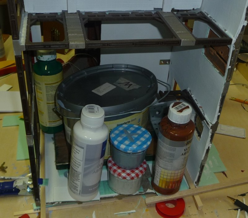 Danke für den Tipp, ich werde nachher eh nochmal in den Baumarkt fahren, mal gucken, ob's dort sowas gibt, oder ob ich ins Bastelgeschäft muß. Die Frontwand mache ich gerade neu. Die Türausschnitte sind schon alle drin. Ich probiere jetzt mal, die Türen umzudrehen. Dann hätten sie quasi einen Rahmen und ich hoffe, daß ich den Abschluß der Wand so sauber hinbekomme, daß das paßt.