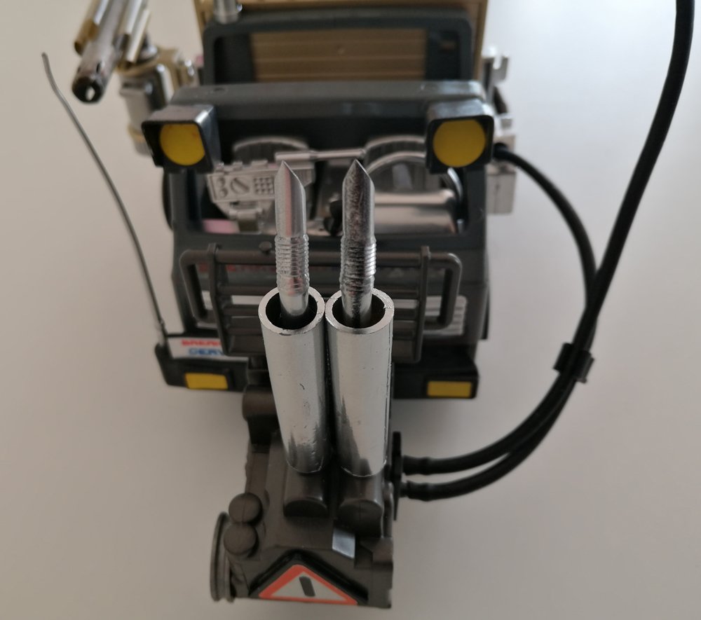 - Die beiden obigen Frontscheinwerfer erhellen den Bereich vor dem Fahrzeug, allerdings schräg nach oben. Entweder sie werden mit Wirkrichtung auf die Fahrbahn angebracht (Keil zwischen A-Säule Fahrerhaus und Scheinwerfer) ODER Keil im Lampenbereich.