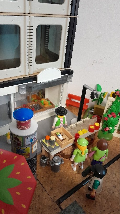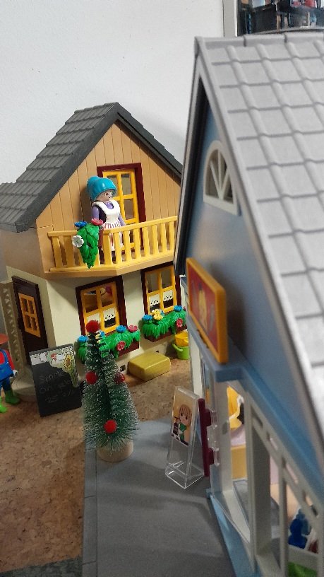 Das Doppeldach des Blumenladens gefällt mir persönlich noch ned so richtig gut. Die Idee, SX mit Steck zu kombinieren, ist schick. Aber die Steck-Turmspitze scheint mir ein wenig zu groß für das Dach drunter zu sein. Und außerdem passen die Farbtöne ned zusammen - zumindest auf dem Bild schaut das ned so gut aus, finde ich. HIer tät ich mal zur Lackdose greifen und dem Dach eine gemeinsame Farbe spendieren