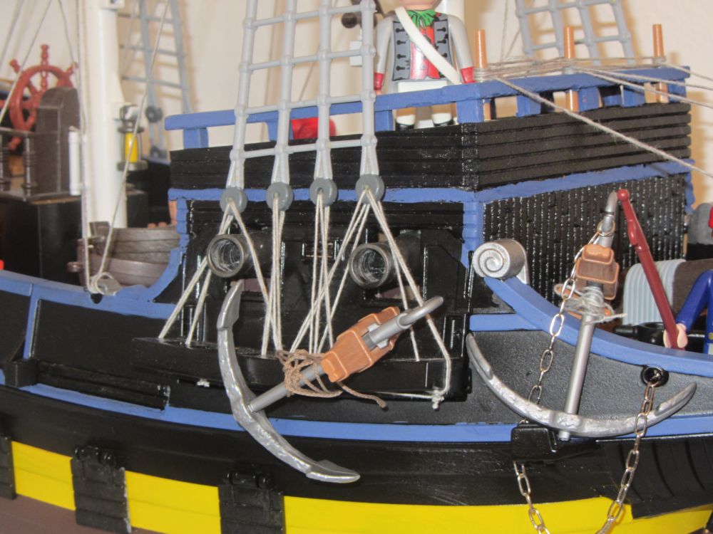 Anfangs wusste ich nicht wie und wo ich die Wanten vorne befestigen sollte - schlußendlich habe ich sie unten abgeschnitten und mit den Fäden um die Geschütze herum an den ausklappbaren Geländer befestigt.