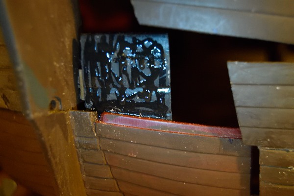 Die Striche sind die Markierungen für die Übergänge der Bohlen. Sie sind hier besonders links an die andere hier nicht sichtbare Seite angepasst und rechts an die abnehmbare Flanke. Man kann eigentlich auch den entstehenden Staub sehen, was also einen Staubsauger zum wichtigsten Werkzeug macht. Der Cutter kratzt nicht ganz so eben, macht aber dafür Flocken statt Staub und hinterlässt natürlich auch eine glattere Oberfläche. Schleifpapier ist natürlich auch gut, macht aber den feinsten Stuab, der dann ganz von allein losfliegt und sich in der Nase finden lässt. :staun1 :nana