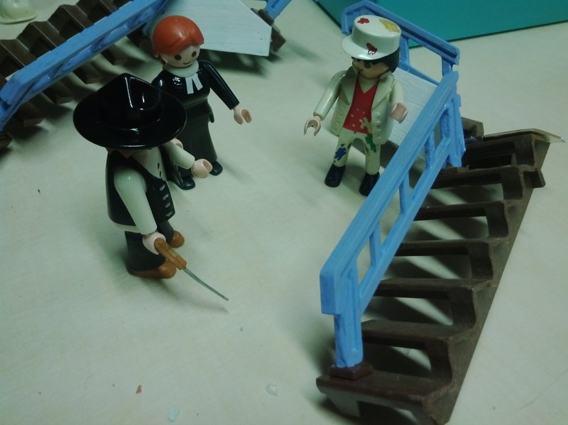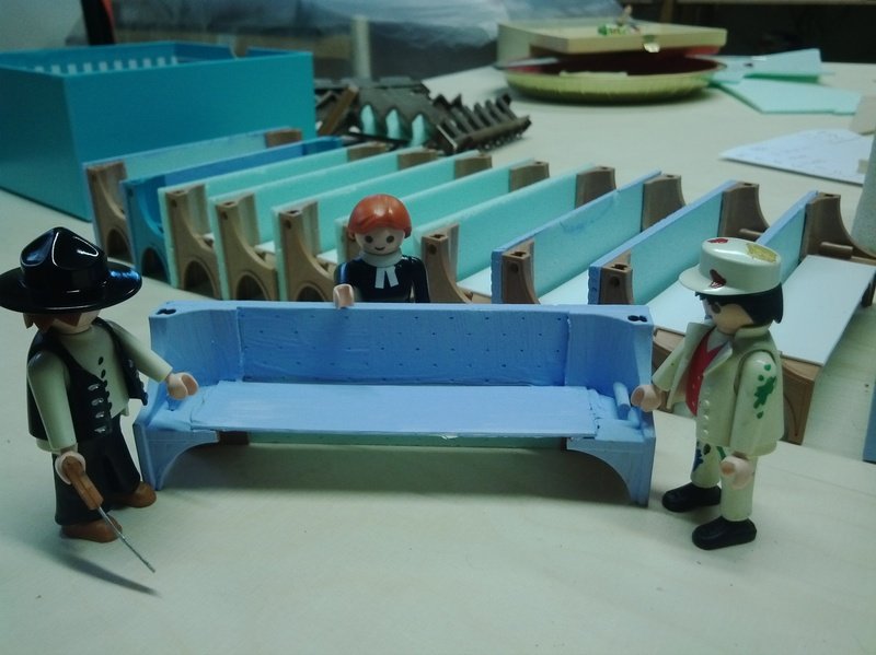 Im Moment versuche ich, alle Blauteile zügig zu streichen, damit ich die Farbe nicht nochmal anmischen muß. Ein Problem, das wir auch "in echt" haben. Der Farbton ist natürlich nicht genormt, und wann immer nur ein Stück nachträglich erstellt wird (wie z.B. zwei hölzerne Kerzenhalter neben dem Altar oder ein weiteres Regal für Gesangbücher), versucht man, so gut wie möglich an den bestehenden Blauton heranzukommen. Ein Problem, das es früher auch schon gab - so ist z.B. der Altar nicht in exakt demselben Blauton wie die Bänke. Der muß zu einem andere Zeitpunkt (oder von einem anderen Maler) gemacht worden sein