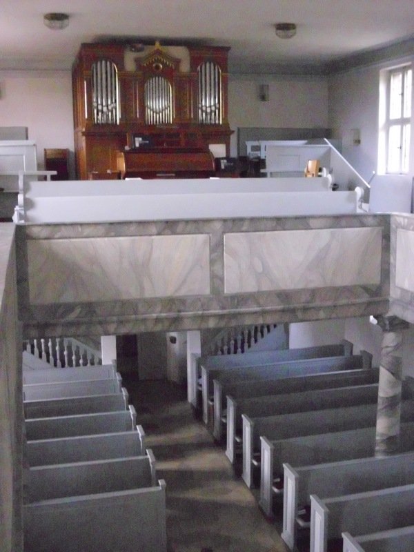 Die Bänke kann man erahnen, aber auch an Altar und Kanzel sind die Blautöne deutlich zu sehen. Ich persönlich bin ein absoluter Freund natürlicher Holztöne und war beim ersten Mal von dieser Farbgebung völlig erschlagen. Aber inzwischen mag ich sie sehr, weil sie der Kirche eine sehr helle, freundliche Atmosphäre gibt.