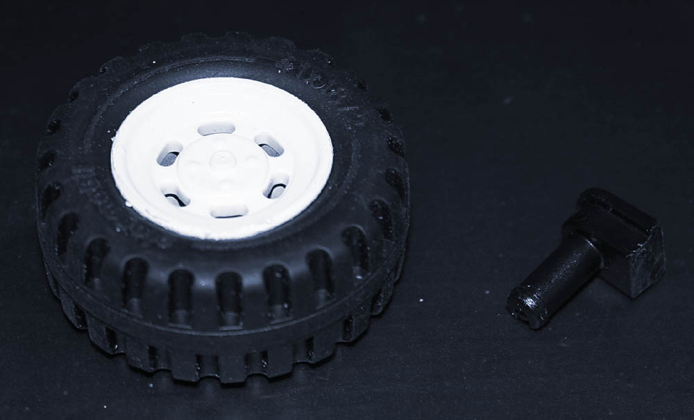 - Achse eines weißen Gabelstaplers aus dem Cargo-Hallen-Set 4314 (ETN 30 82 5140 – 2,55 € für 2 Räder + Achse). Hat genau die gleiche Größe/Aussehen wie die Geländewagen-Räder.