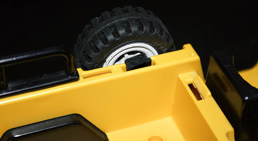 Achse und Räder des Gabelstaplers voneinander trennen (wie auch immer, ist ziemlich schwierig!). Radansatz (Kunststoff) mit dem Dremel (o.ä.) absägen. Mittelloch des Rades mit Bohrer vergrößern.