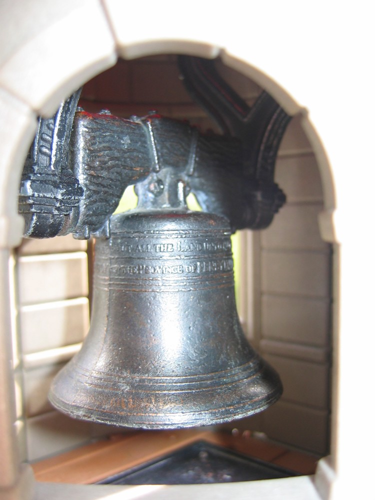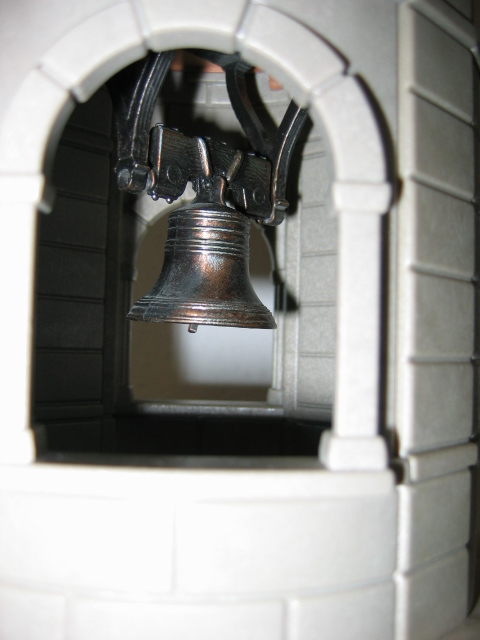 Vor langer Zeit (noch im alten Forum zu sehen) habe ich meine Stecksystem-Kirche angefangen, doch fehlte mir seither eine passende Glocke. Nun fand ich kurz hintereinander gleich 2 Glocken (unterschiedlich große Modelle der Liberty Bell), die mir gut gefielen und ich beide verwenden wollte. Da diese Kirche aber nur einen Turm hat, musste ich die beiden Glocken untereinander anbringen. Auf den Fotos sieht man nur die 2 obersten Stockwerke der insgesamt 6 des gesamten Turmes.