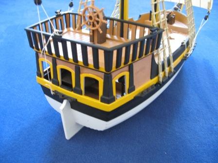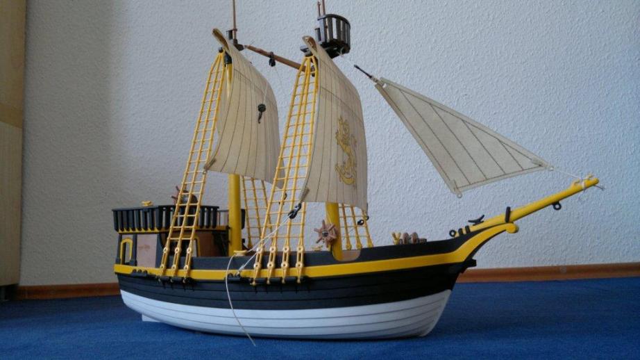 Orientiert habe ich mich an Bildern (von Modellen) der Royal Navy aus dem 18. Jahrhundert. Dominante Modellfarbe war wie unschwer zu erkennen, gelb-schwarz. Also habe ich ein altes Playmo-Piratenschiff ebenso bemalt.