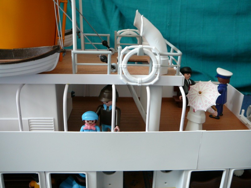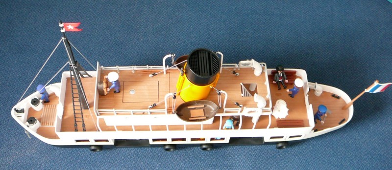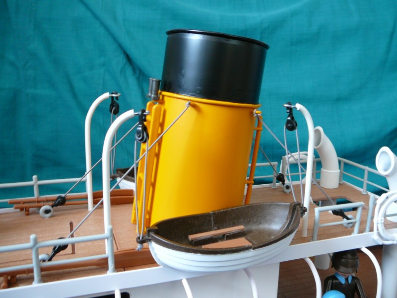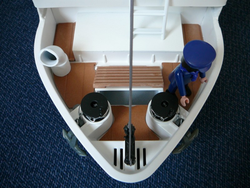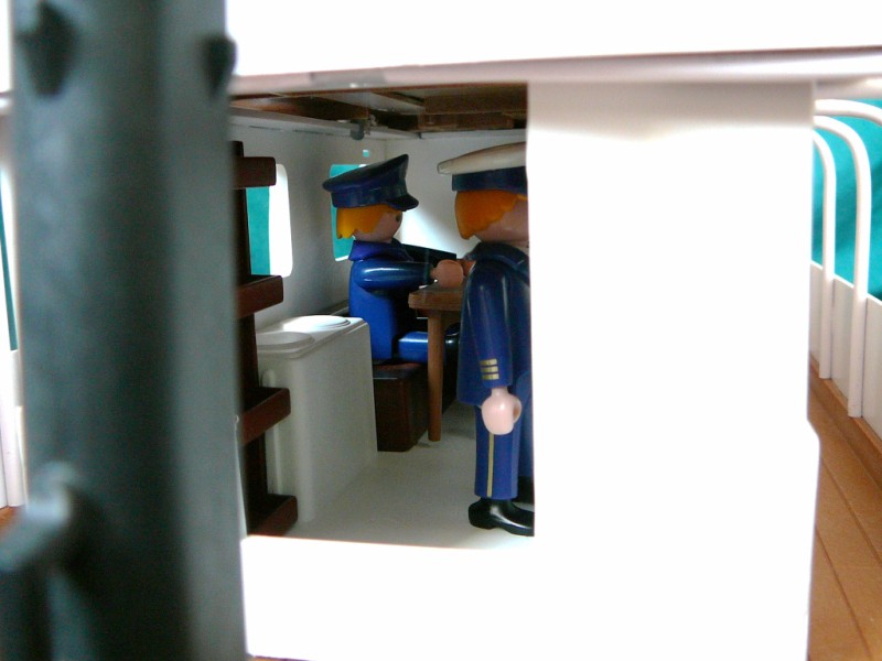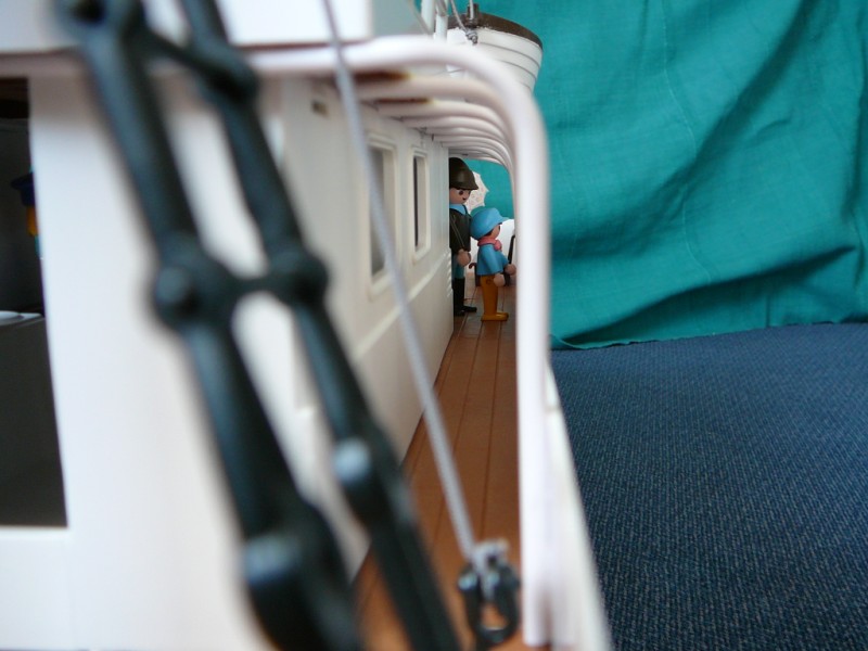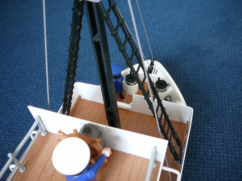 - Die Brücke besaß im Original ein abnehmbares, zeltähnliches Dach. Um das Schiff oben nicht noch wuchtiger werden zu lassen, hab ich darauf verzichtet, und der Kapitän darf Seeluft schnuppern...
