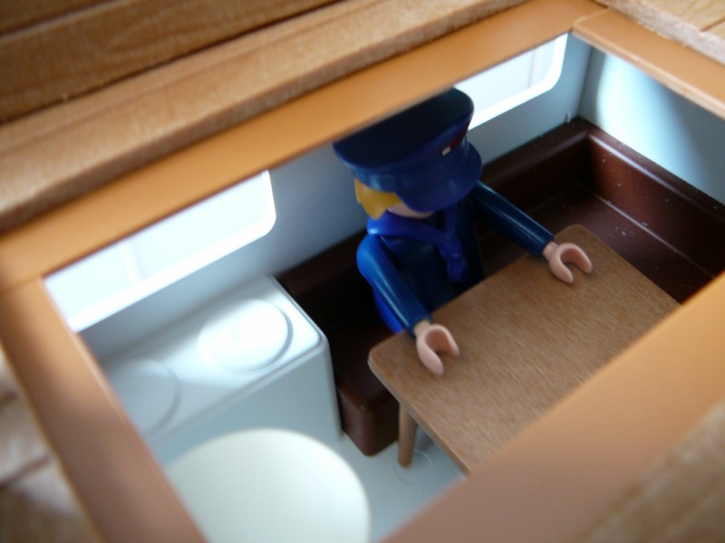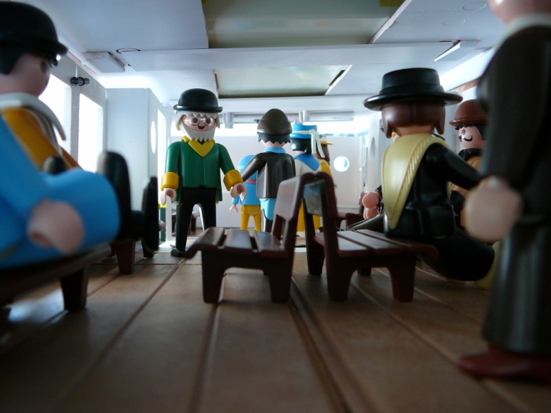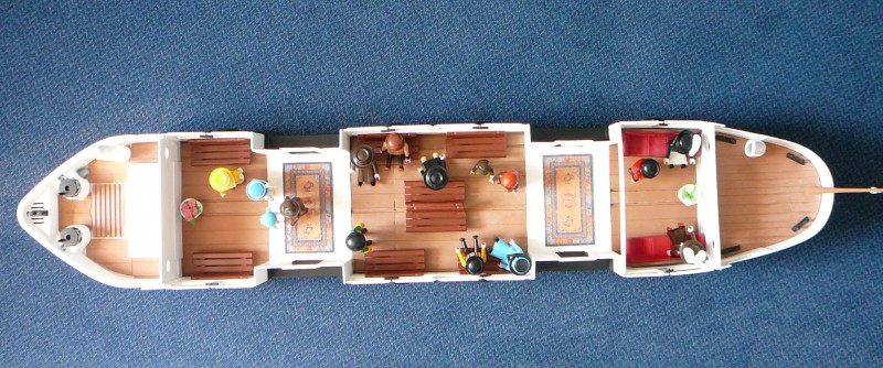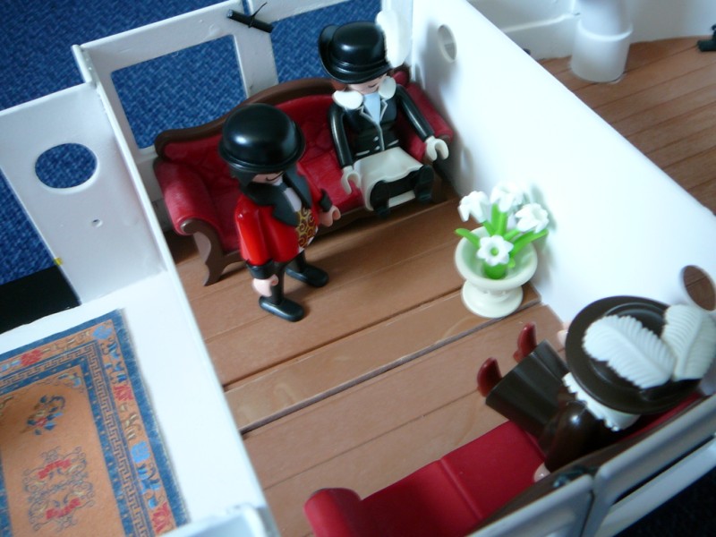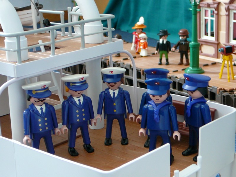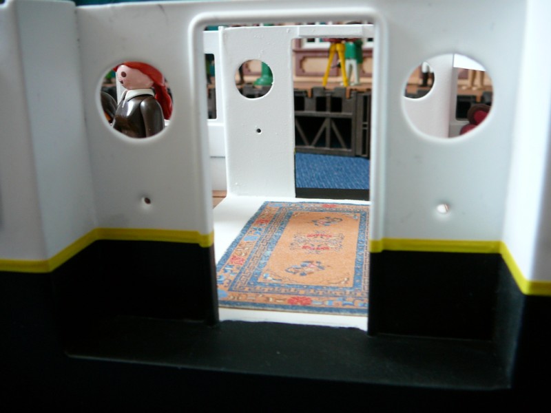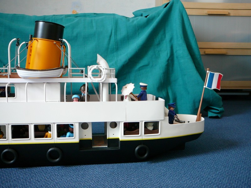 - Die Brücke besaß im Original ein abnehmbares, zeltähnliches Dach. Um das Schiff oben nicht noch wuchtiger werden zu lassen, hab ich darauf verzichtet, und der Kapitän darf Seeluft schnuppern...