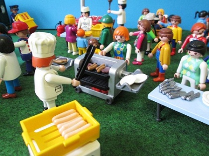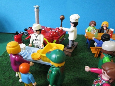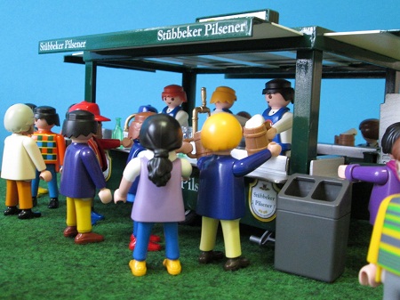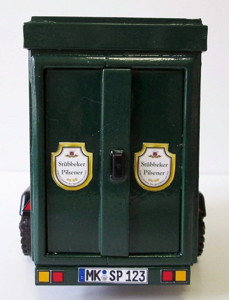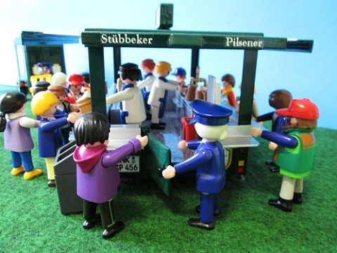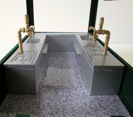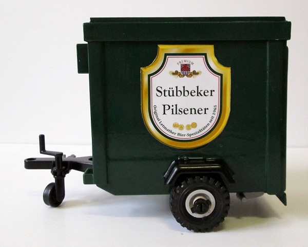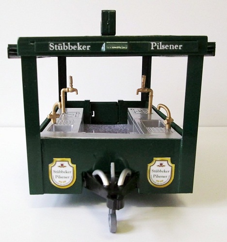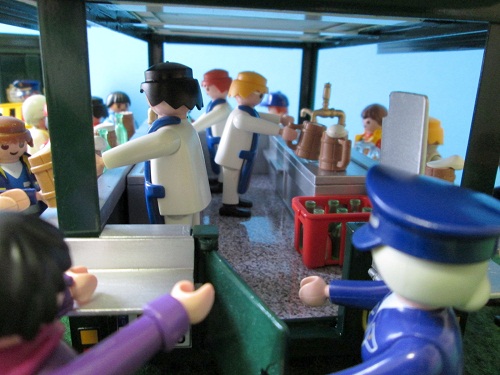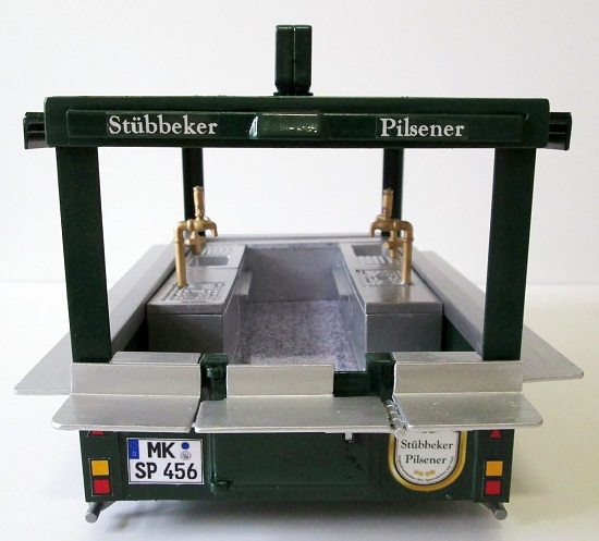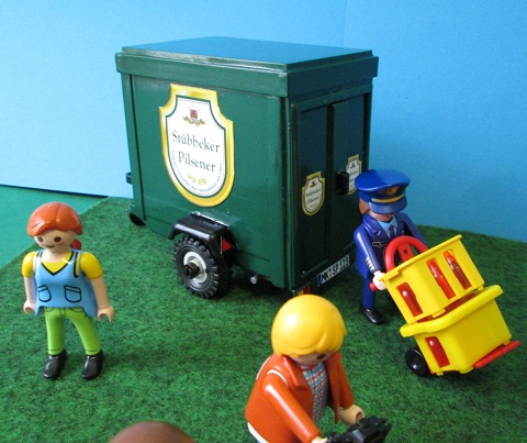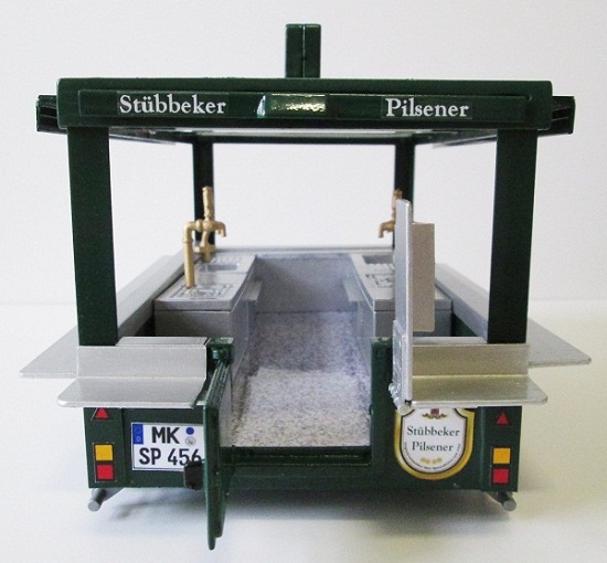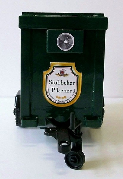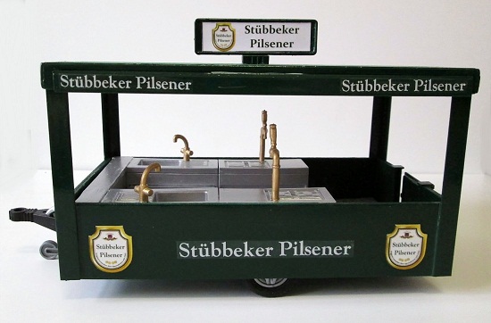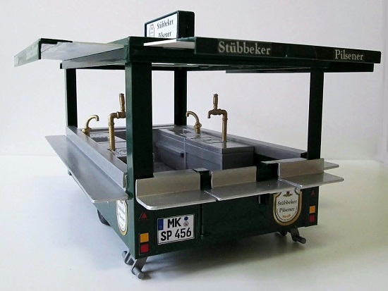 Die gesamte Verstrebung, die Kaffeemaschine, Bänke usw. wurden abgedremelt um eine ebene Bodenplatte zu erhalten. Damit eine Einrichtung montiert werden konnte, habe ich auch teilweise die Radkästen entfernen müssen. Die Seitenverkleidung wurde dann außen auf den Rahmen geklebt. Der Anhänger und die abnehmbaren Thekenbretter bestehen aus Kunststoffprofilleisten und Platten,. Die Thekeneinrichtung (Spüle und Zapfanlage) stammt aus dem Set 4857.