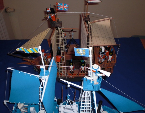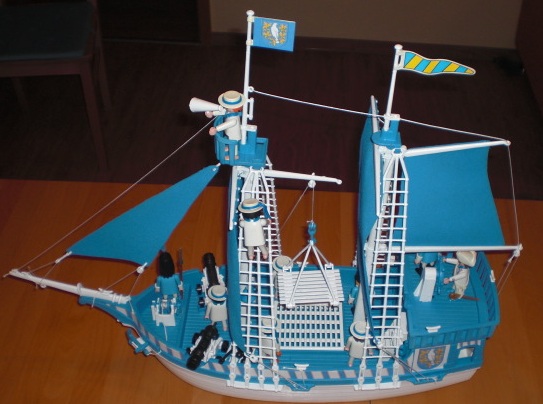 Allerdings würde ich sagen, könnten hier ein paar andere Farbtöne dem ganzen noch wirklich gut tun (braun für die Masten, etc.), da es sonst ein wenig unnatürlich und künstlich wirkt in meinen Augen (zweifarbig). Unter anderem der Tisch im Inneren etc. sollte vielleicht hölzern sein. Hat ein wenig einen Touch von Playmobil Color Teilen.
