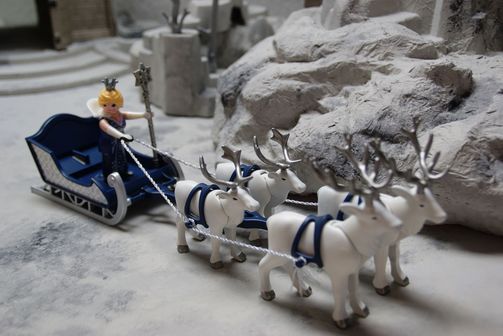 Der Schlitten mit den weißen Rentieren sind toll aus.