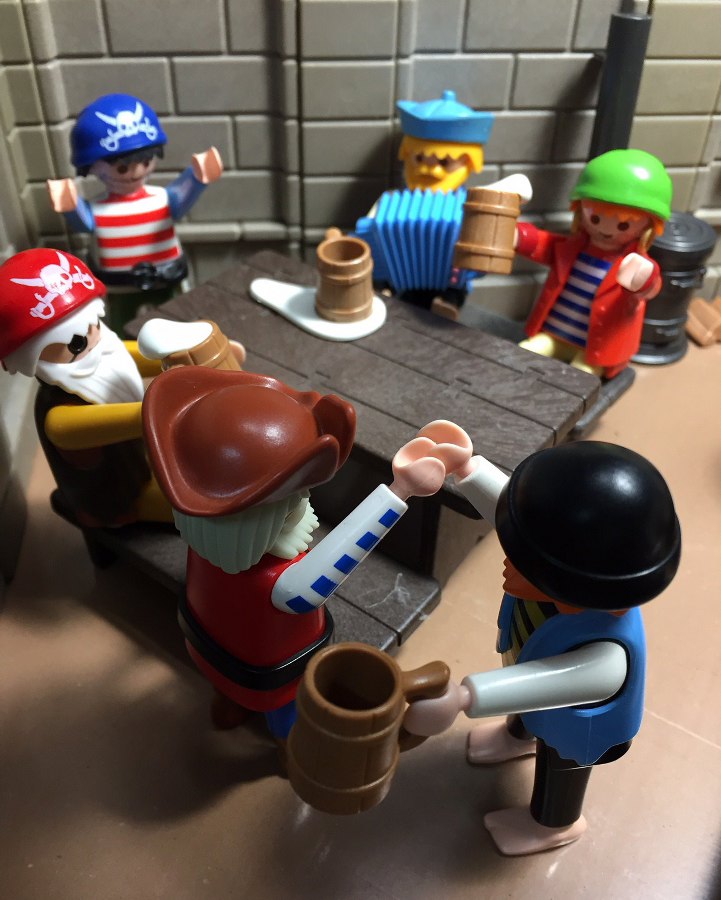 Hier saß er noch mit befreundeten Piratenkapitänen zusammen, die sich das Schauspiel des neuen Schiffes nicht entgehen lassen wollten