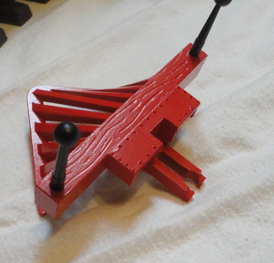 Dazu kamen dann noch ein anderer Schornstein und ein alter Kuhfänger aus dem LGB Programm.Der wurde dann wie der Ring am Kessel noch rot lackiert.