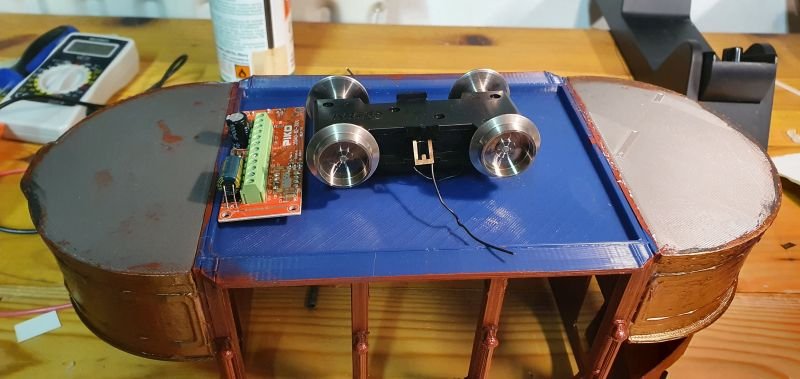 Der erste Versuch war ein 11,1V-Akku. Damit fuhr die Bahn recht langsam und hatte kaum die Kraft, sanft durch eine R1-Kurve zu fahren. Jetzt ist ein 14,8V-Akku verbaut. Ob das dann wirklich besser ist, wird sich im Sommer zeigen, wenn ich mal auf eine Bahnanlage gehen und das Schätzla richtig fahren lassen werde können.