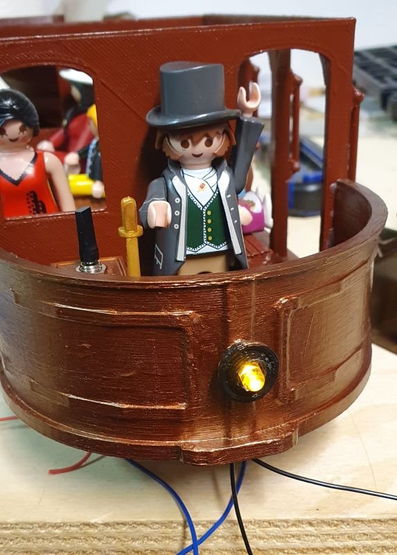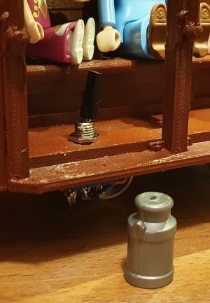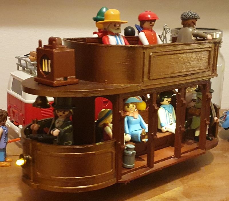Das Problem mit der Sitzbank ist: Ich hab die Tram nicht gebaut. Laut Stu ist da kein Hohlraum drunter, sondern teilgefüllte Struktur (das Teil ist ja ein 3D-Druck). Daher habe ich mich ned getraut, da "aufzubohren" und zu schauen, ob da nicht vielleicht doch was geht. Davon abgesehen sind die Akkublocks, die die Tram braucht, tatsächlich auch recht "mächtig" (3cmx3cm als Querschnitt) und würde vermutlich gar nicht passen, selbst wenn unter der Sitzbank ein einziger, großer Hohlraum wäre. Ich hatte auch nach Optionen im Oberdeck gesucht. Aber dann muß der Strom irgendwie von da oben nach unten kommen, und das ist immer aweng pfriemelig. Die Konstruktion hat keine versteckten Hohlräume, die ich zum Kabelziehen hätte nehmen können, und Kabel im Sichtbereich müssen sauber und straff liegen. Das heißt, daß das Oberdeck nicht mehr abgenommen werden könnte (z.B. um mal eine LED zu wechseln oder wenn am Akku was zu machen wäre).