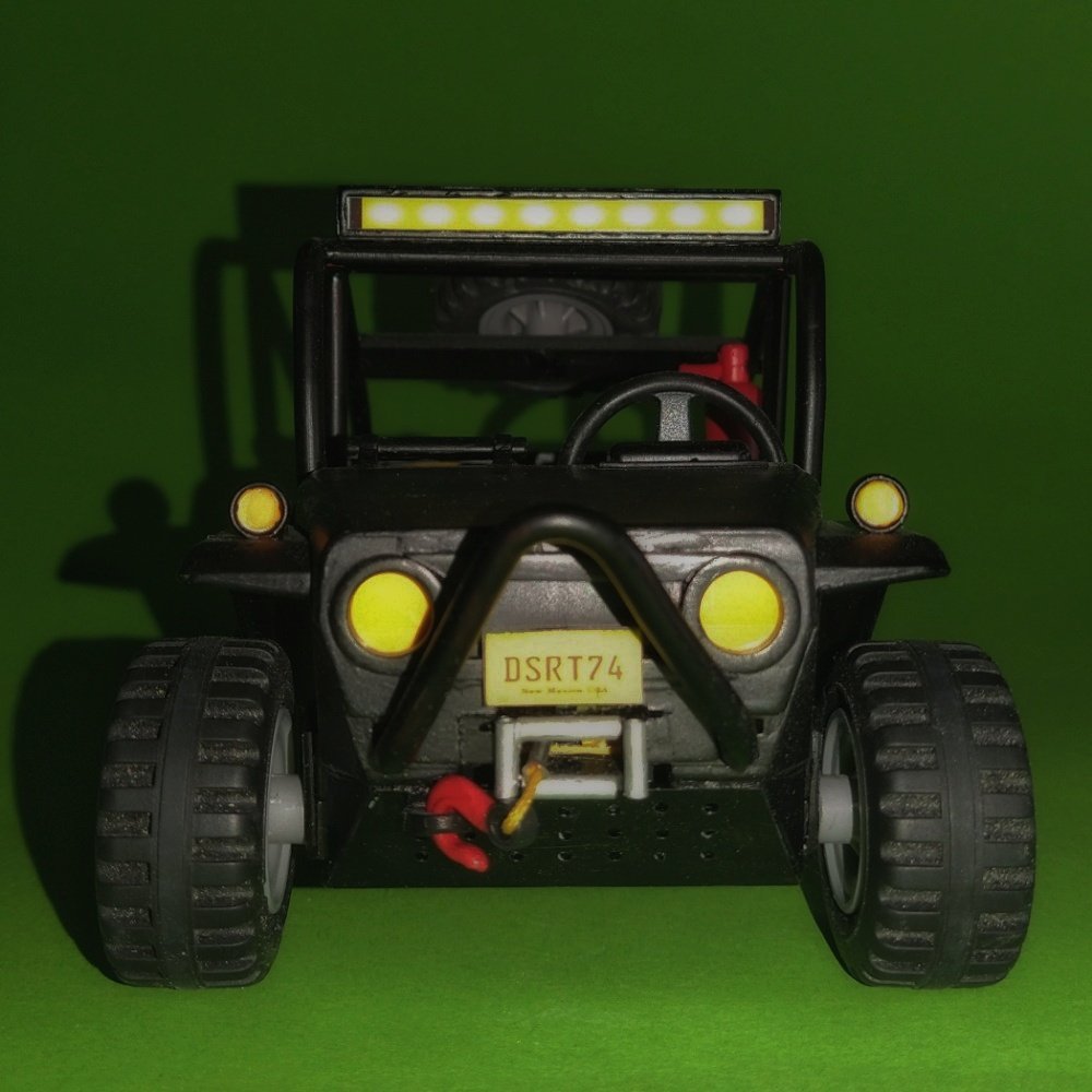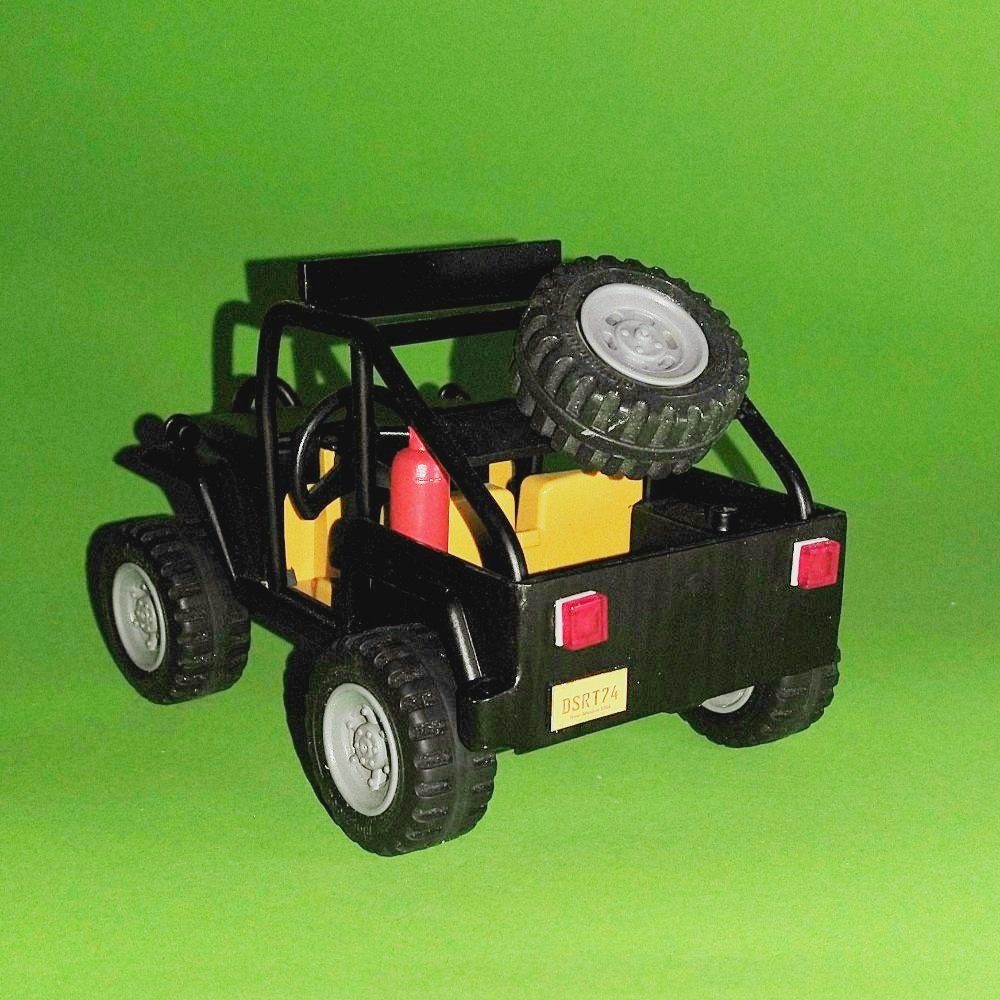 Wie ich bereits in meinem Safari-Thread schrieb, fehlt mir beim Playmo-Jeep der Kühlergrill. Bei diesem Modell fehlte außerdem noch die Windschutzscheibe - da die im groben Offroad-Einsatz eh nur stören würde, habe ich mich für ein entsprechendes Modell entschieden. Also größere Räder an das höher gelegte Fahrwerk, ein Überrollkäfig, eine (funktionierende) Seilwinde, einen dieser neuen LED-Balken und einen Unterfahrschutz gebastelt, und fertig ist das Spaßmobil.