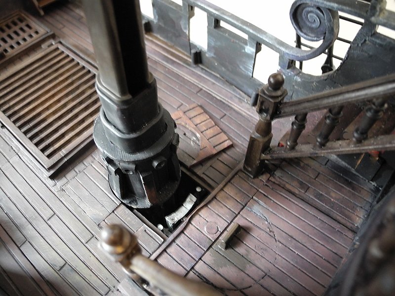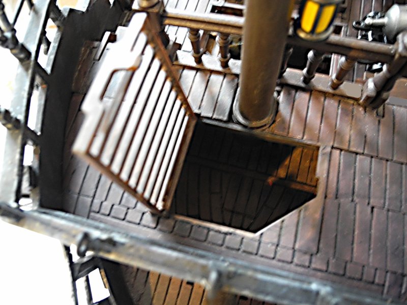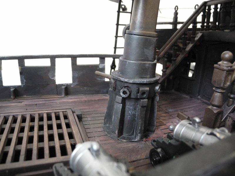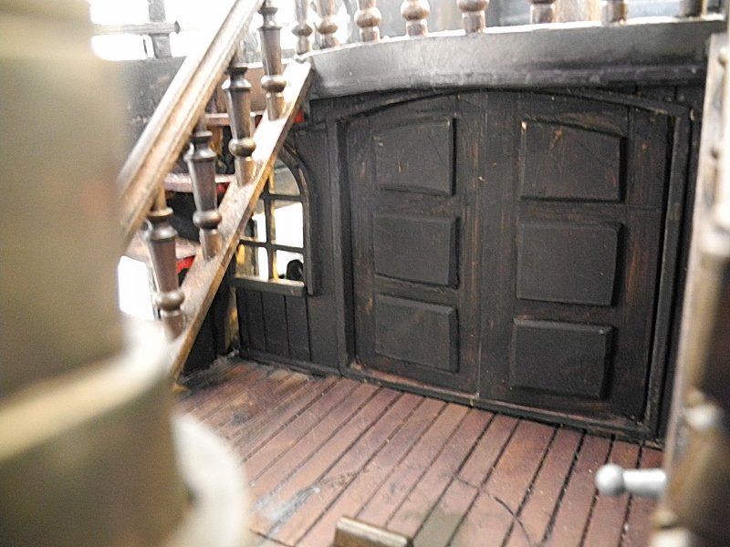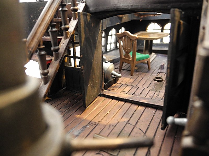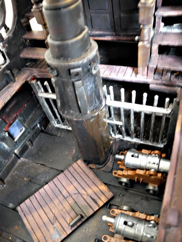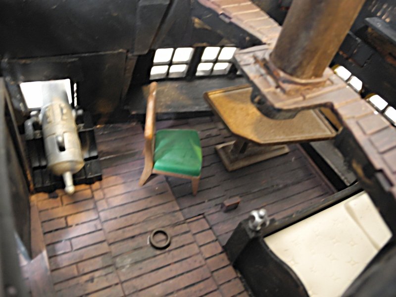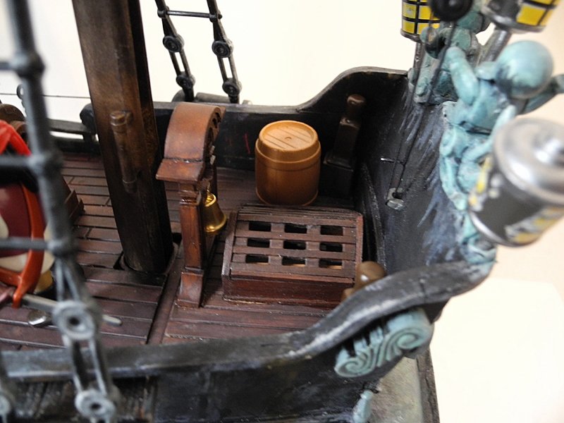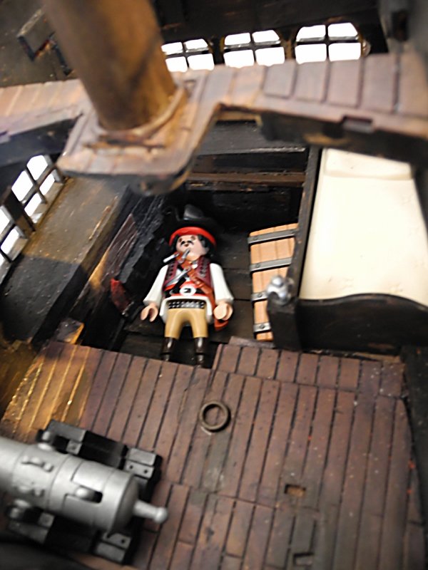 Die Ankerwinde lässt sich drehen, die Glocke läuten, die Segel raffen, (die meisten) Kanonen abfeuern und der Kompass kann aus seinem Schrank, der vor dem Ruder steht, entnommen werden (auf dem Foto kann man ihn nicht so gut erkennen).