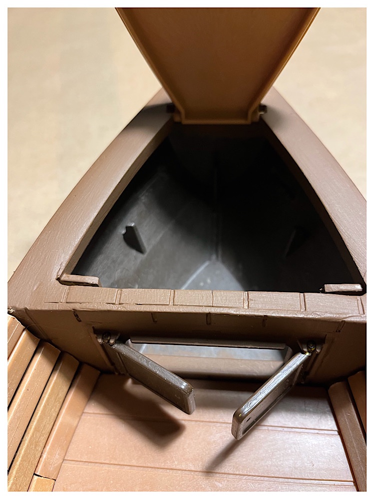 Im inneren habe ich vom Sandkasten Haus die Pforte genommen und eingearbeitet. So kann man das Vorderteil von oben und der Seite beladen.