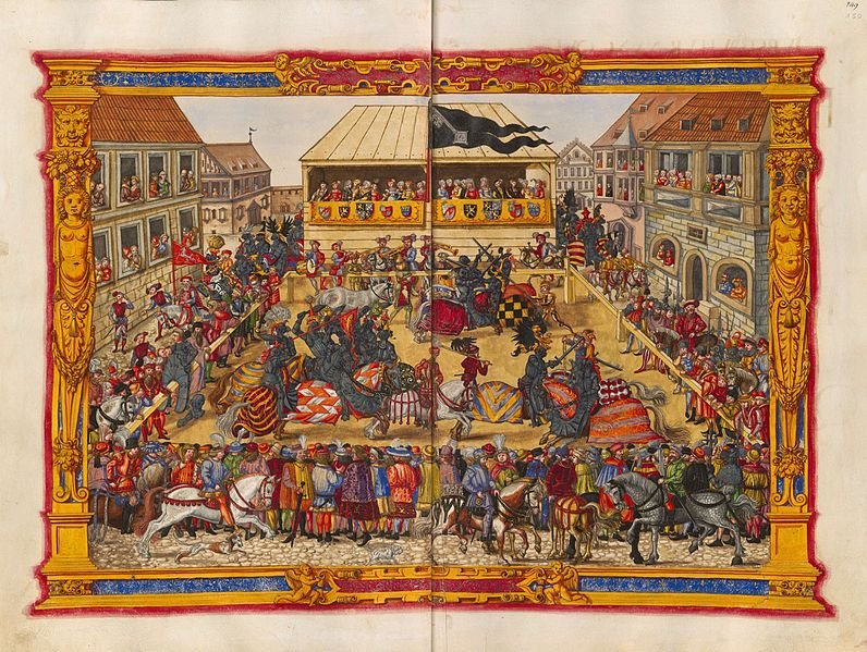 Turniere wurden im Mittelalter größtenteils in den Städten abgehalten (nicht auf Ritterburgen, da war gar kein Platz), deshalb habe ich mir diese Ansicht aus der Schedelschen Weltchronik von 1493 meiner Heimatstadt München zur Inspiration der Stadtmauer, sowie des Stadttores (hier zu sehen das Isartor) genommen: