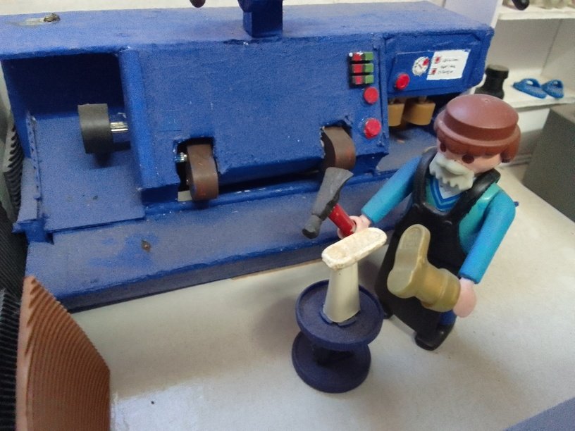 I have been a shoemaker for many years and fearing that Playmobil is not going to remember us, I decided to create my own shoe repair shop, with its finishing machine, or "The huge sandpaper machine" as people call it.