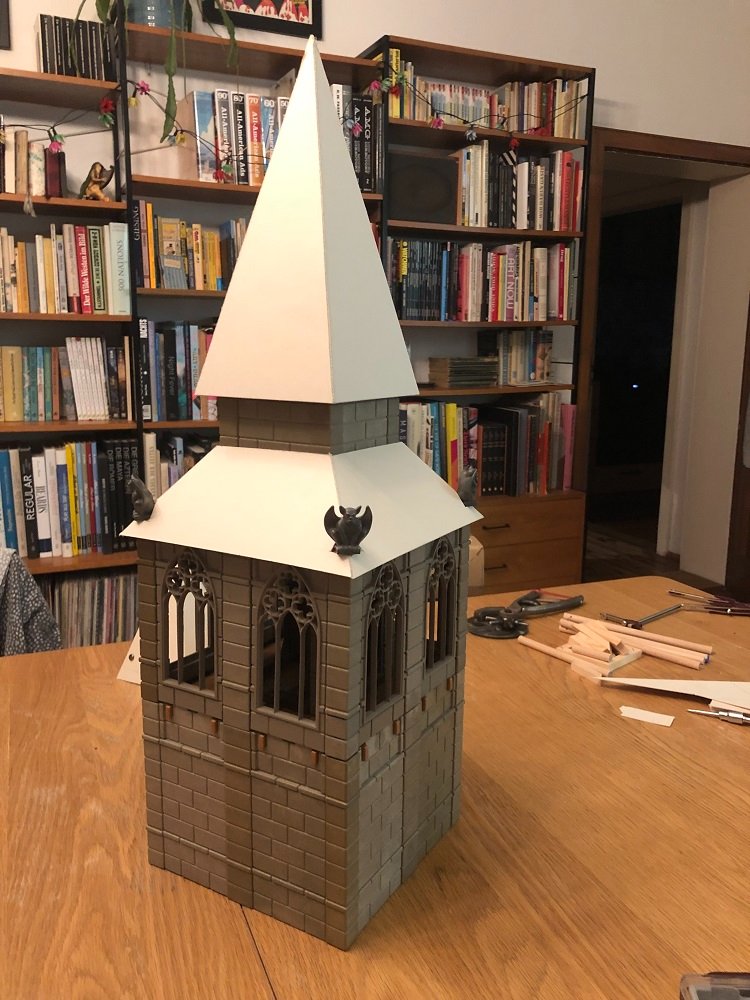Die Dächer von den zwei schmalen, runden Türmen gefallen mir überhaupt nicht. Die Pappe war zu dick und sie erinnern einfach an Partyhütchen.