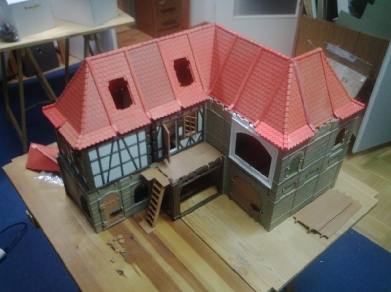 An vielen Stellen (wie z.B. bei den großen Fenstern) konnte ich auf die Originalteile von vor 10 Jahren zurückgreifen. Nur das Dach, das an den Rundturm anschließt, war verschollen und mußte neu gefeilt werden.
