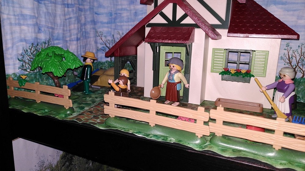 Familie vor Bauernhaus mit gemaltem Boden und Hintergrund