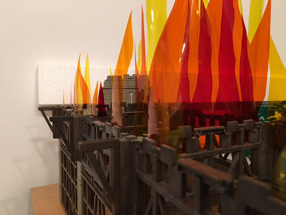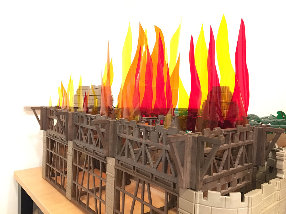 Ich finde es durchaus stimmig, dass die runterfallenden Balken die selben Flammen haben, wie die Balken oben. Sicher könnte man auch Playmofeuer nehmen, aber so sehen je eher die "gewollten" Feuer in der Halle aus..