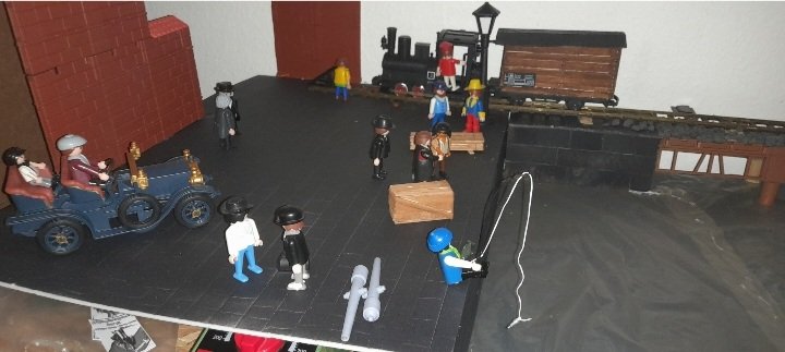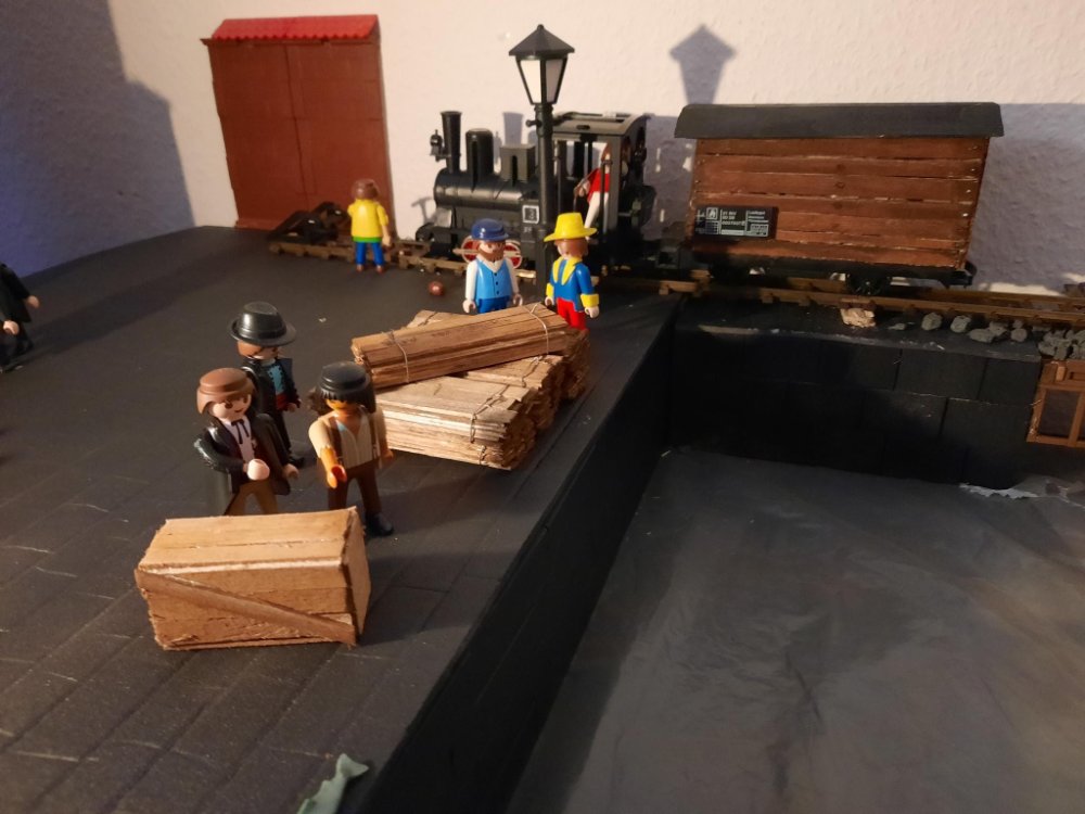Endlich konnte ich das neue Gebäude bauen, sowie einen Waggon und andere Details. Nach der Aufnahme der Bilder habe ich alle Gebäude gealtert und Details am Waggon ergänzt.