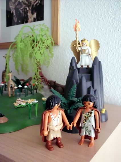 Der Garten Eden ist noch in Arbeit, aber hier haben wir schon mal die Vertreibung aus dem Paradies - Adam, Eva und der Engel mit dem flammenden Schwert!