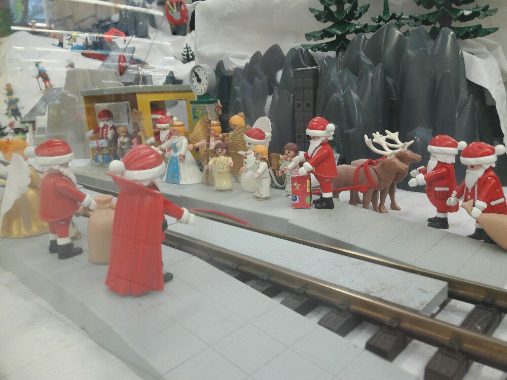 Am Bahnhof warten die Weihnachtsmänner und Engel auf den Weihnachtszug