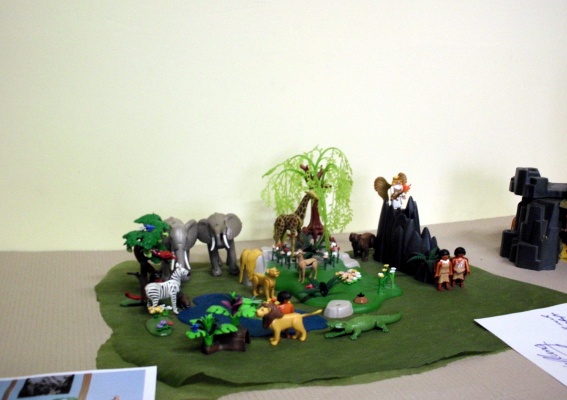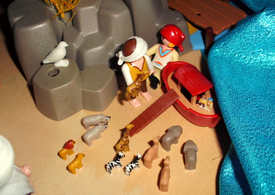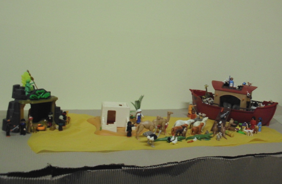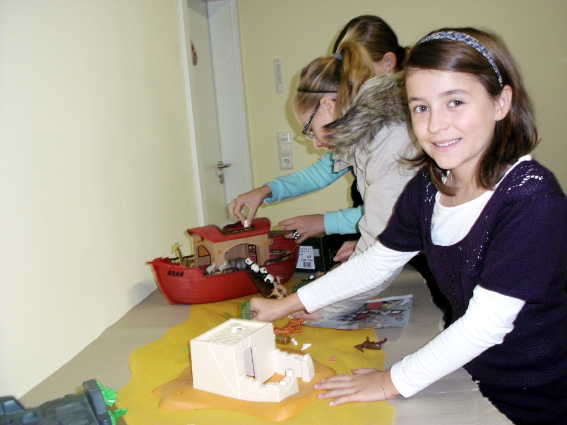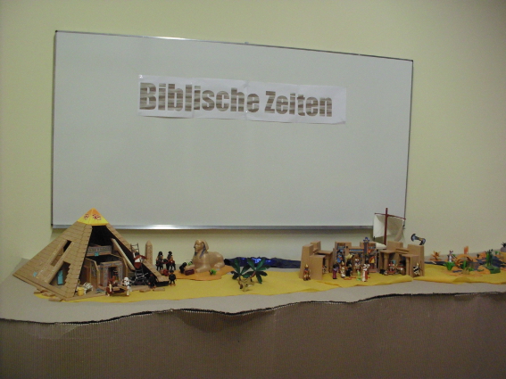 Ich bin erst nach Anfang des Kindergottesdienstes dazu gekommen. Als sie mich geholt haben, haben sie mich links und rechts an der Hand genommen und mich fast in den Raum gezerrt, so heiß waren sie aufs Aufbauen! Ich hatte die Fotos, die ich hier eingestellt habe, als Vorlage ausgedruckt. Die Mädels haben die Schöpfung und die Arche aufgebaut, und die Jungs waren total fasziniert von den Ägypten-Sachen. JEDE Falltür musste ausprobiert werden :grinsen