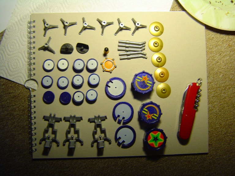 In der Weihnachtszeit hab ich mich mal meinen Plänen zur Kreation neuer Musikinstrumente gewidmet. Da ich selbst Schlagzeug spiele war klar, dass ich erstmal ein anständiges Schlagzeug zu basteln hatte. Hauptsächlich hab ich bei der ganzen Sache mit dem Taschenmesser einige Sachen gekürzt, bzw. andere neu aufgeklebt.