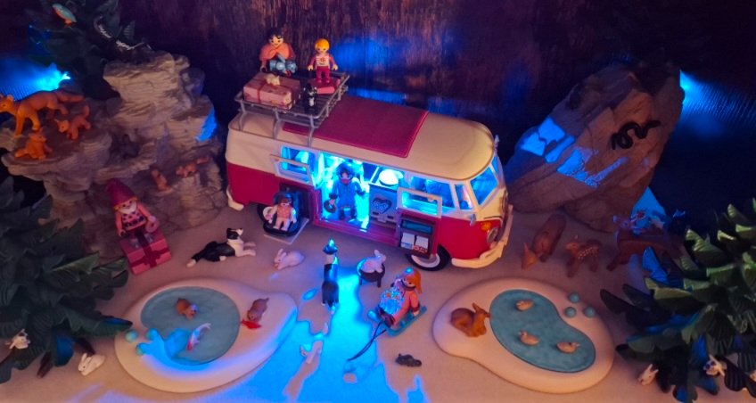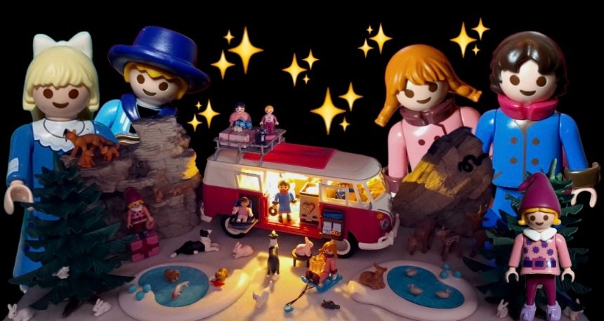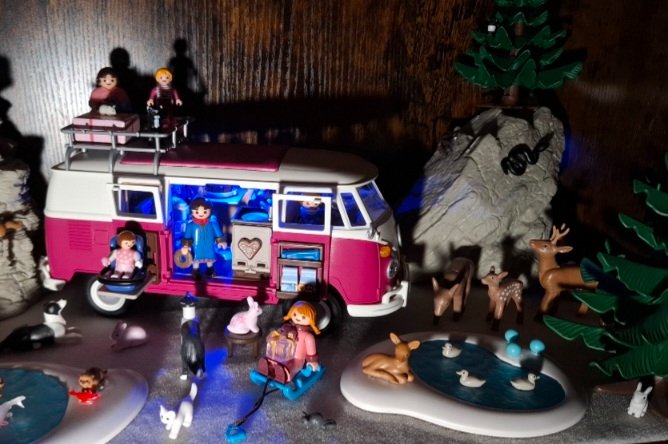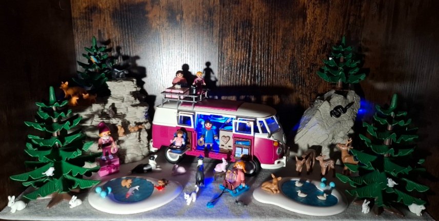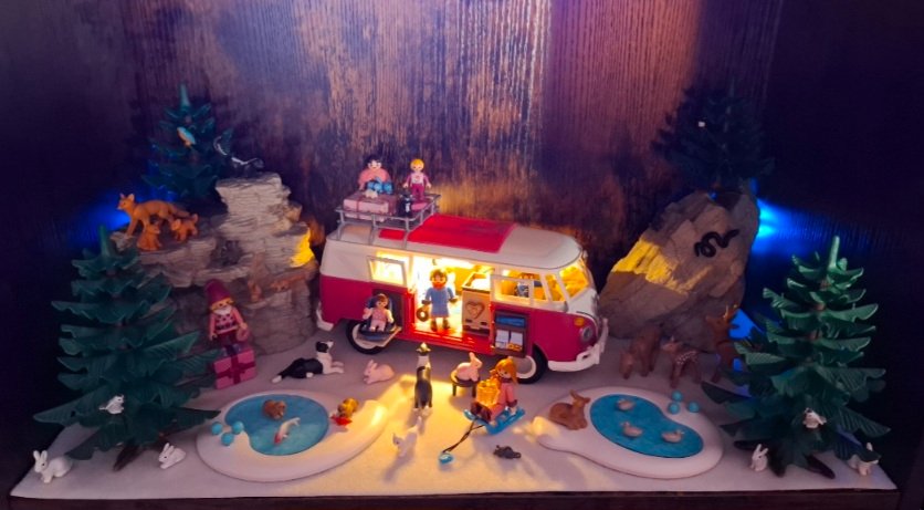 Meinen VW Bulli Umbau habe ich ja inzwischen abgeschlossen und meine schönsten Heidi Figuren aus dem Schrank geholt,dazu noch ein paar süße kleine Tiere, zwei Eisflächen, Felsen und ein paar Bäume.