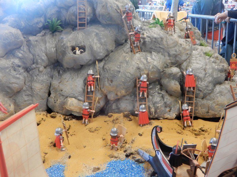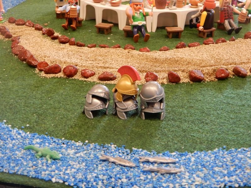 Dieser Stapel Römerhelme und die Anlandung der Römer am Berg ist ne klasse Idee.