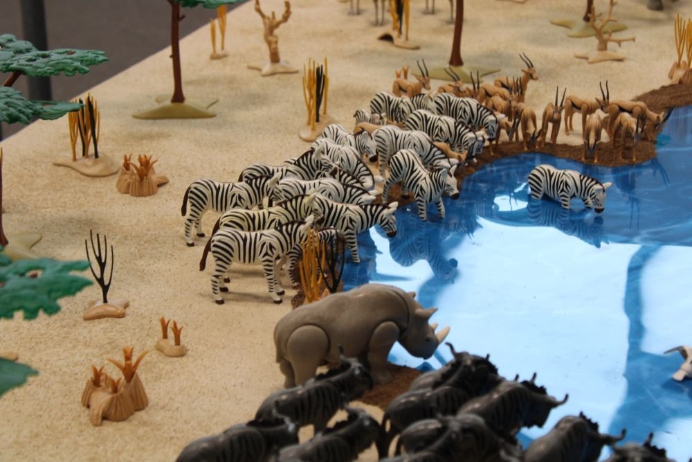 Nur der Tieraufmarsch rund ums Wasserloch ist mir irgendwie zu geordnet: Die Hälfte des Ufers ist tierfrei, aber auf der anderen Seite gibt es die Zebra-, die Büffel- die Gazellen-Ecke. Bin kein Experte, aber würden sich die Tiere nicht eher mehr mischen?