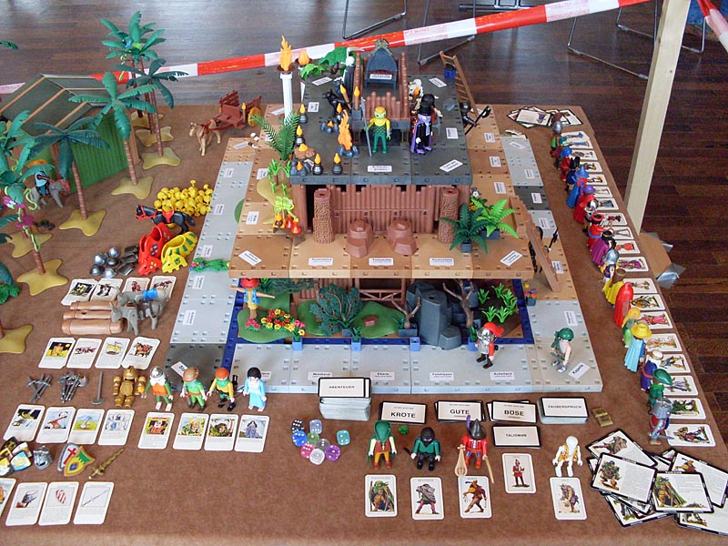 Der Spielplan im Original und als Playmobil-Version. Davor stehen die verschiedenen Charaktere, die man spielen kann.