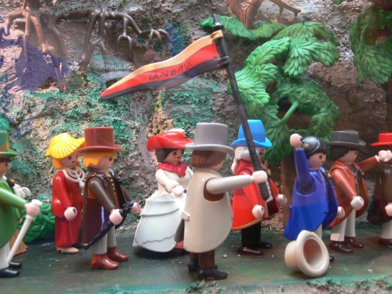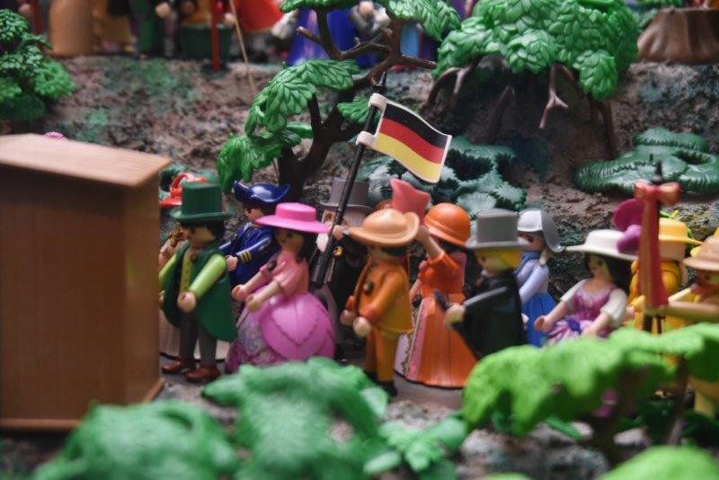Hallo zusammen,bricoleur hat geschrieben:Ich habe hier so einen ganz dicken Schinken über Hambach. Da ist auf dem Innendeckel und Vorsatzblatt der Hintergrund dieser Lithografie ganz groß abgebildet. Da sehe ich Rot-Gold-Schwarz, Gold-Schwarz-Rot, Schwarz-Rot-Schwarz, Rot-Schwarz-Gold und Schwarz-Gold-Rot. Irgendwie scheinen die sich damals noch nicht so einig gewesen zu sein. Ich denke, wenn man heute in einem Playmobil-Diorama die aktuelle deutsche Flagge nimmt, dann fällt das höchstens historisch Sachkundigen auf. Den Otto-Normalbetrachter würde man sonst nur verwirren, und Schulkinder sowieso. Es ist eh schon schwierig genug, heute den Sinn dieses Events zu vermitteln.