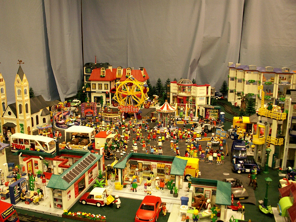 Viele Ideen sind erst nach diesem Termin entstanden und auch fertig geworden (und zwar so, dass es auch funktioniert...) und wir haben uns "eigentlich" zu wenig um den Namen gekümmert. Daher ist Eisenbahnlandschaft zwar etwas "lieblos", aber es trifft es eigentlich immer noch. Im Grunde konnten wir uns auf der Bühne komplett austoben. So stellen wir uns halt eine playmobil-Landschaft vor. Mit allen Themengebieten, die da so möglich sind. Da ist auch Platz für "alte" klickys und alte Fahrzeuge. Das gehört aus unserer Sicht auch dazu. Auf der anderen Seite ergänzen die neuen Fahrgeschäfte und die playmo-Band einen schönen Festplatz ideal.