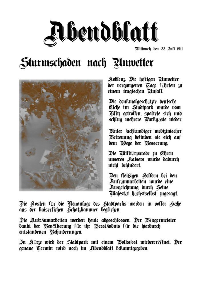 Und wie das Leben so spielt ... wenige Tage zuvor hätte man meinen können, ein Sturm wäre durchs Museum gefegt ... jedenfalls hat es dein großen Baum von Elise umgehauen. Das hat mich doch glatt zu einer journalistischen Eskapade verführt ...