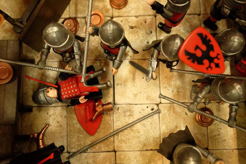 Ein großes Tohuwabohu, Hunnen gegen Nibelungen, Nibelungen gegen die Mannen von Rüdiger. Tragisches Detail: Rüdiger und Giselher, Schwiegervater und Schwiegersohn, bringen sich gegenseitig um.