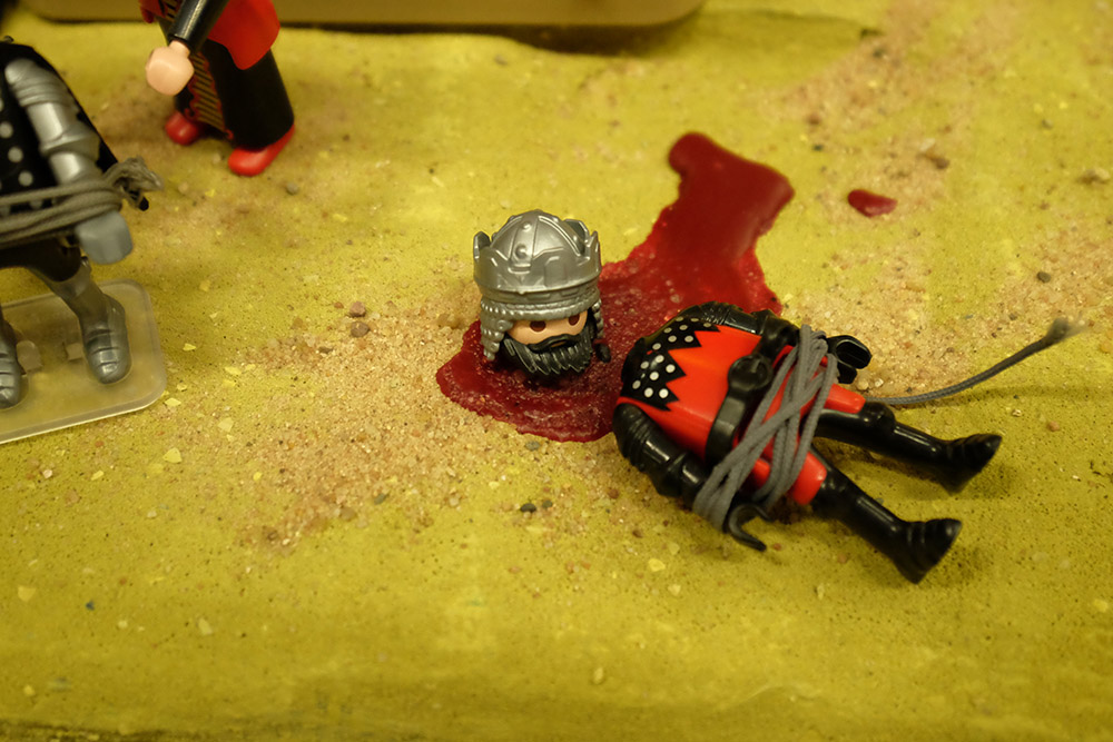 Am Ende sorgt ein Partygast für die Entscheidung. Dietrich von Bern bezwingt die letzten beiden Überlebenden der Saalschlacht, König Gunther und Hagen. Gefesselt übergibt er sie dem Hunnenkönig und seiner rachsüchtigen Frau Kriemhild. Diese schlägt ihrem Bruder Gunther den Kopf ab, da er nicht verraten will, wo der Nibelungenhort, der Schatz ihres ersten Gatten Siegfried, versteckt ist. Hagen stirbt aus demselben Grund. Das ist die letzte im Dio dargestellte Szene. Tatsächlich wird Kriemhild noch vom Waffenmeister Hildebrand (gehört zu Dietrich) erschlagen, der es als sehr unangemessen empfunden hat, dass hier eine Frau Blutgericht veranstaltet.