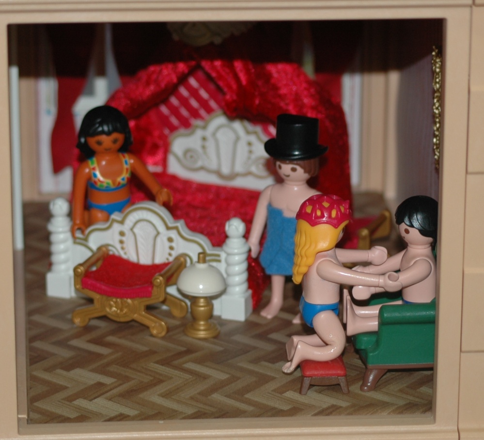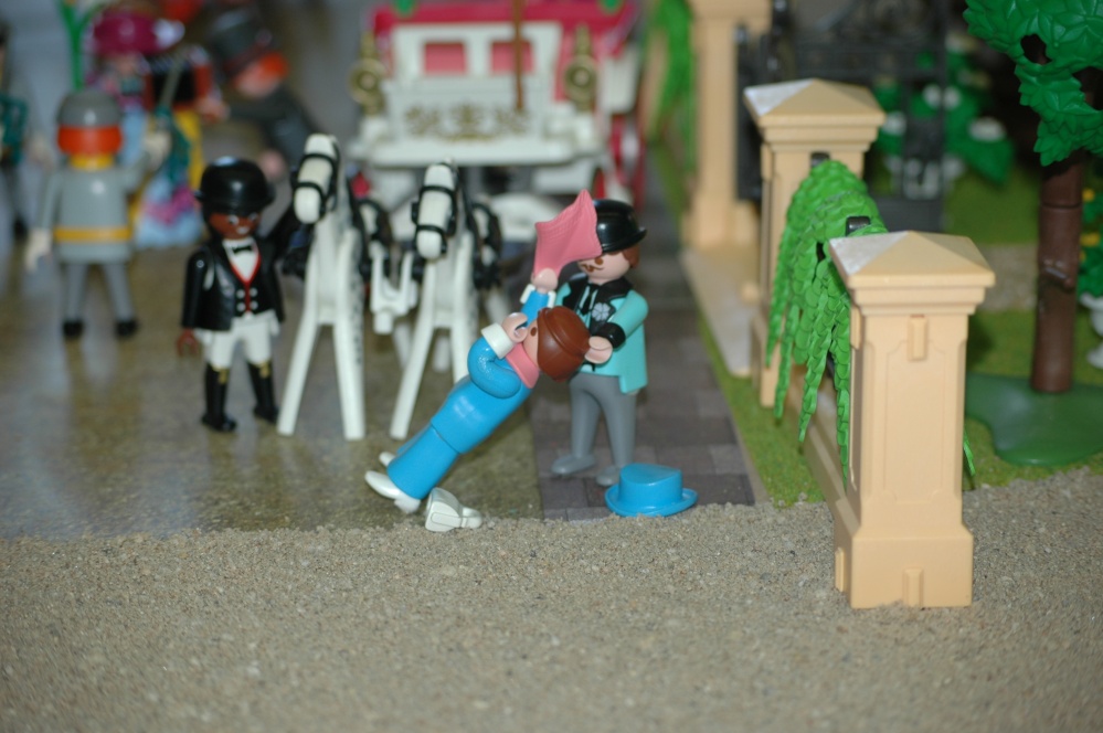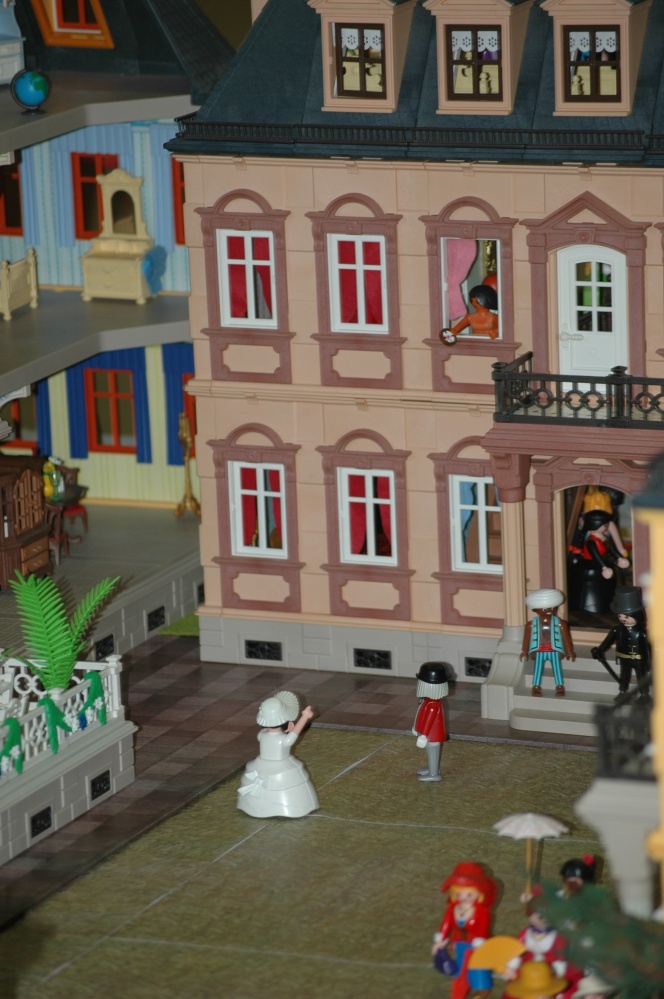 hier noch eine junge Dame, die kurz vor der Ohnmacht steht, weil eine weitere "Dame" ihre Verkaufsargumente aus dem Fenster hängt. Was müssen die Herren in Charleston auch so vergesslich sein...