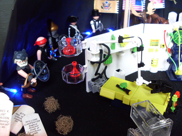 James Bond meets Jurassic Park. Ein tolles Diorama mit zwei riesigen Vulkanen mit geheimen Basen im Inneren, Agenten, geklonten Dinosauriern und Skeletten <3.