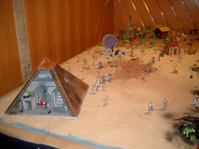 auch an den König, der nicht nur zum Aufbau, sondern auch tatkräftig mit eigenem Figurenmaterial beigetragen hat, und noch ein Raumschiff abstürzen ließ, damit es sehr realistisch aussieht! Und lackieren kann seine Majestät auch!