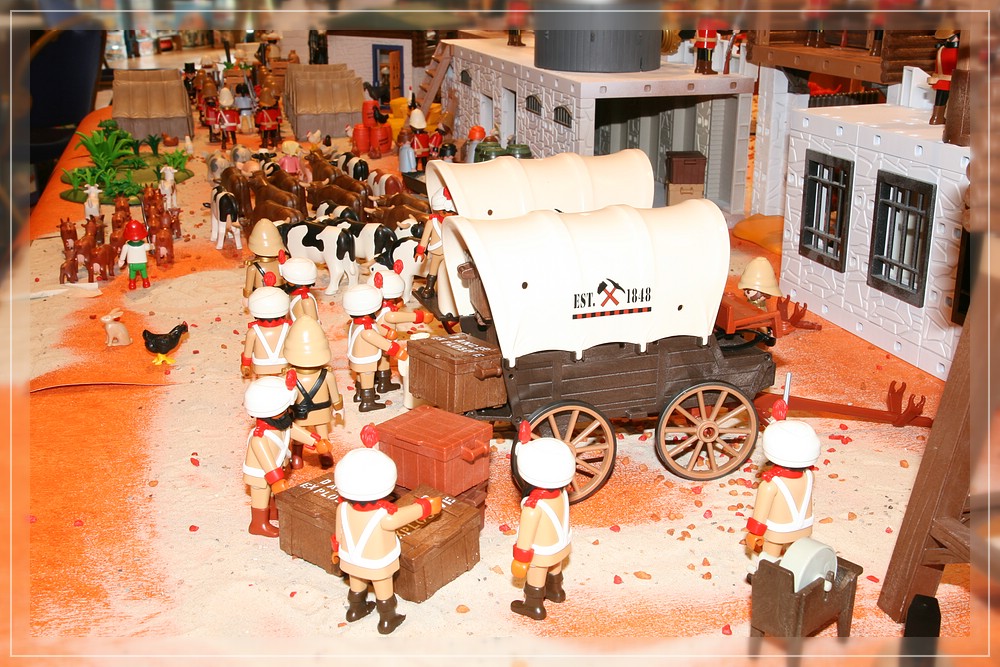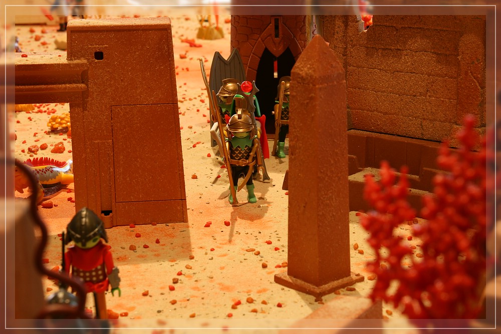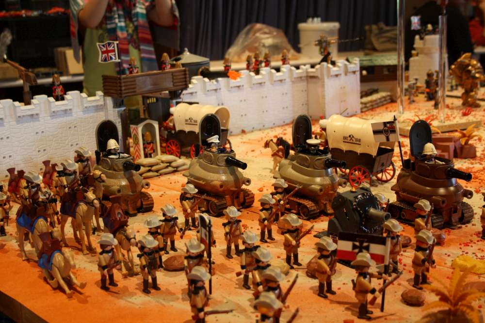 Ich hab´einige sehr lustige Momente an meinem Dio erlebt: Eine Schulklasse(?), jedenfalls ne ganze Horde Kinder kam an den Tisch und die Jungs waren alle fix begeistert von den Panzern ("Boah, guck mal Panzer!Fett!""Häh? Seit wann gibbs denn Panzzer von Playmobil [der Junge lispelte!!]??!! Ey, guck mal, Passkall, Panzzer von Playmobil! Voll geil!!") während zwei kleine Mädchen sich vollends auf die kleinen Krabbeltierchen konzetrierten ("Oh guck mal, ein Skorpion"[mit dem kleinen Ärmchen eine Figur umwerfend]"Da, ein Salamander!!!"[vor lauter Verzückung über den Lurch noch eine Figur umwerfend]. Ein anderes Mädchen, circa 3 1/2, mit Omma im Schlepp, war fasziniert von den Kühen und Ziegen, die Soldaten, inzwischen wieder aufgerichtet, interessierten sie nicht die Bohne. Lediglich der Drachen in schwarz konnte sie noch zu einem Kommentar hinreissen "Den hat Leon auch!", muß wohl der große Bruder gewesen sein. Ein anderer kleiner Junge war so angetan von den angemalten Krebsen, daß er mir einen abgekauft hat - jawohl, das möchte ich festgehalten haben, es hat jemand ein von mir perönlich lackiertes Exponat gekauft!!!(