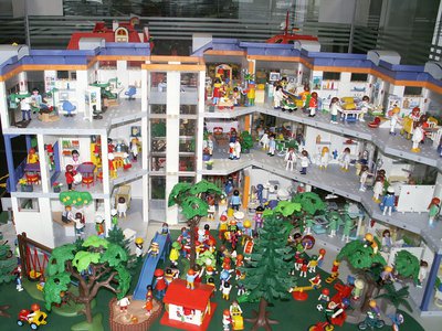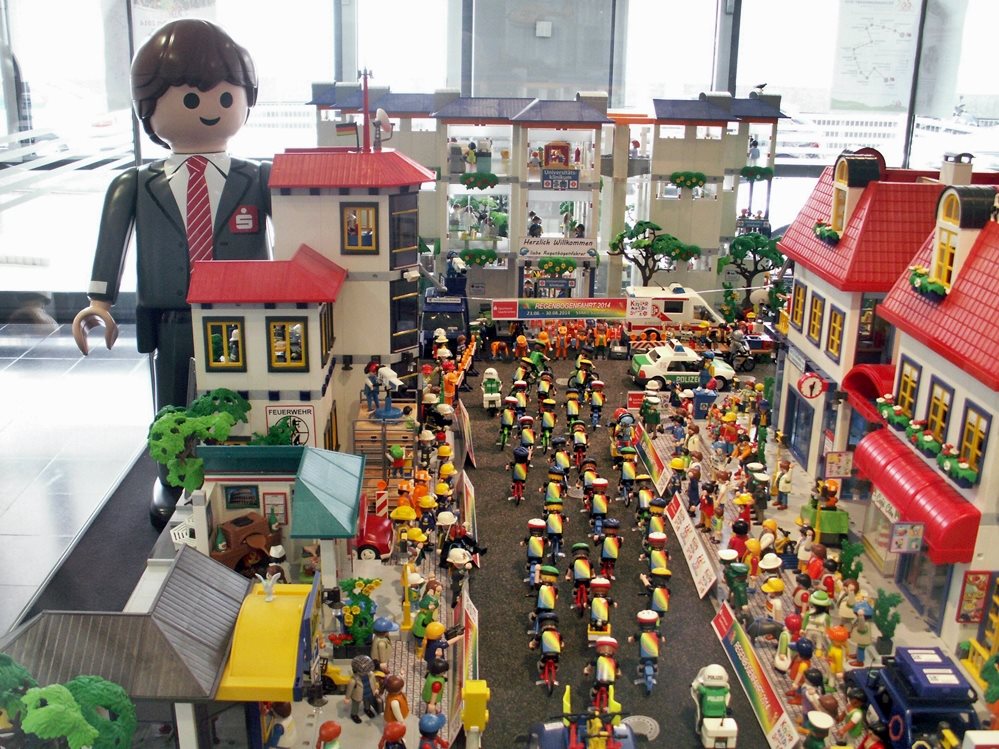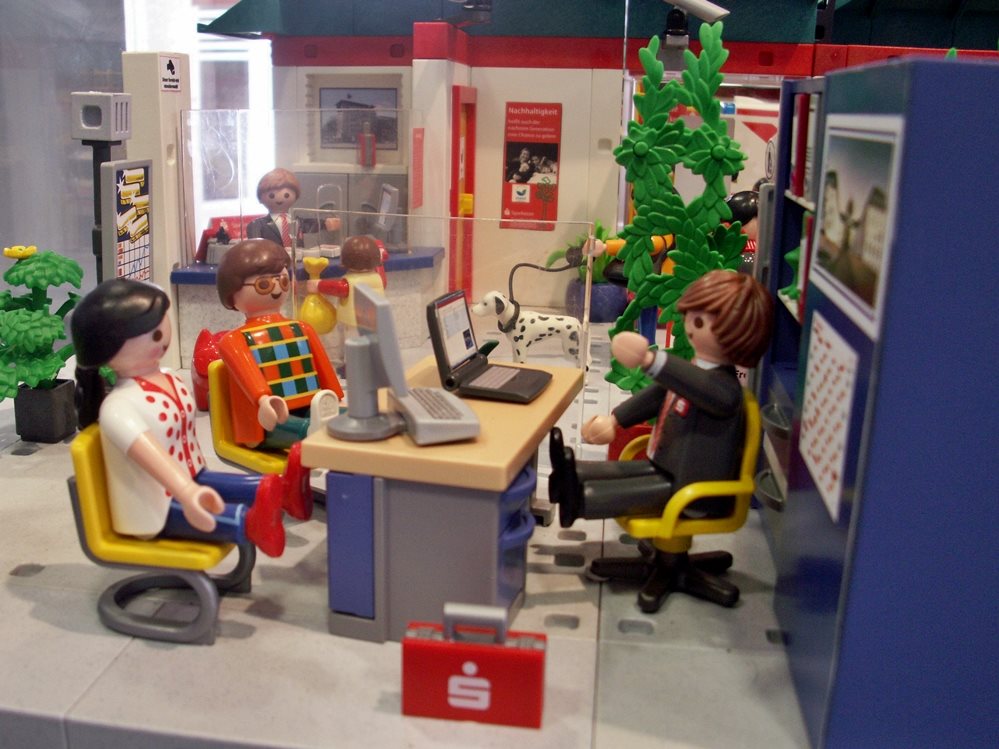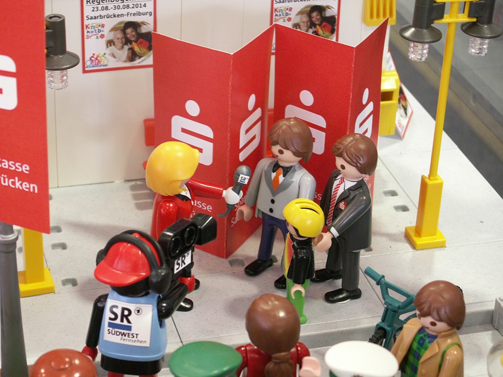 Um im Vorfeld dieser Fahrt entsprechende Aufmerksamkeit zu erreichen, haben wir, die playmobil-FANatiker, Thorsten, Tobias und Thomas im Eingangsbereich der Hauptstelle der Sparkasse in Saarbrücken ein Diorama (1,4 x 3,2m) mit playmobil-Figuren aufgebaut. Ebenfalls hat uns der Deutsche Sparkassenverlag aus Stuttgart eine playmobil –Großfigur („natürlich“ der Sparkassenmann) für diese Aktion leihweise zur Verfügung gestellt.