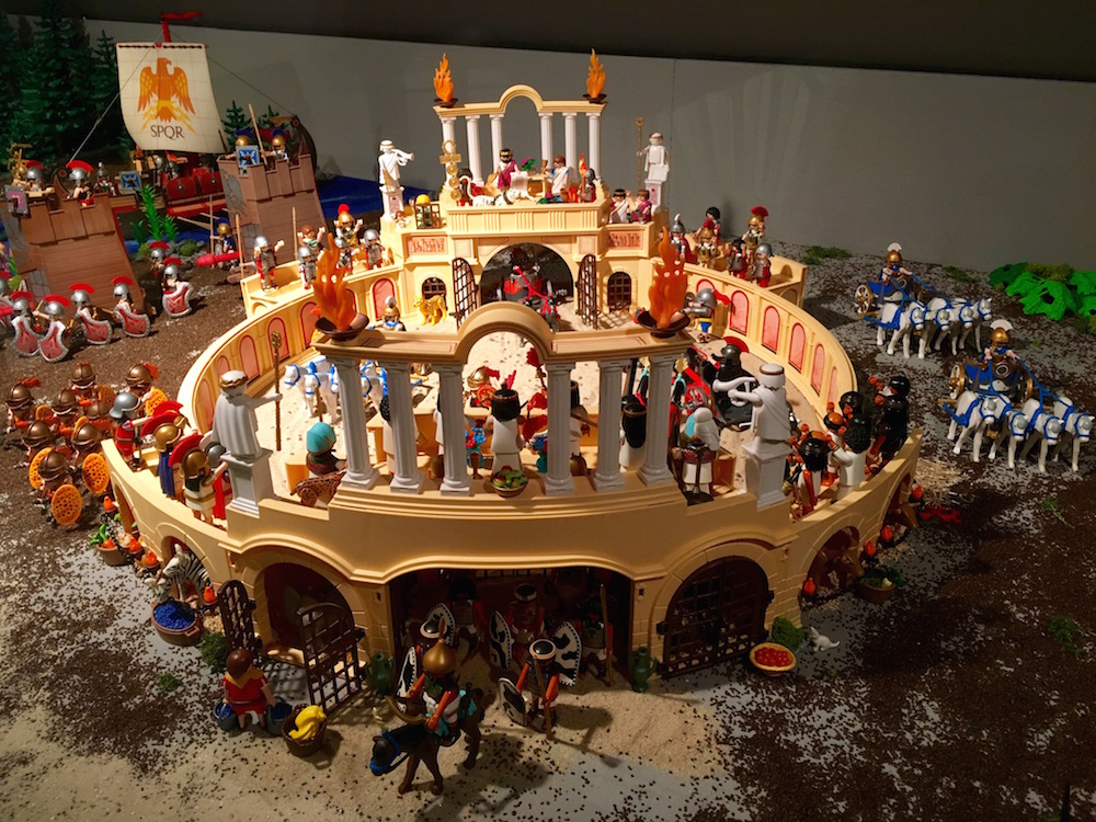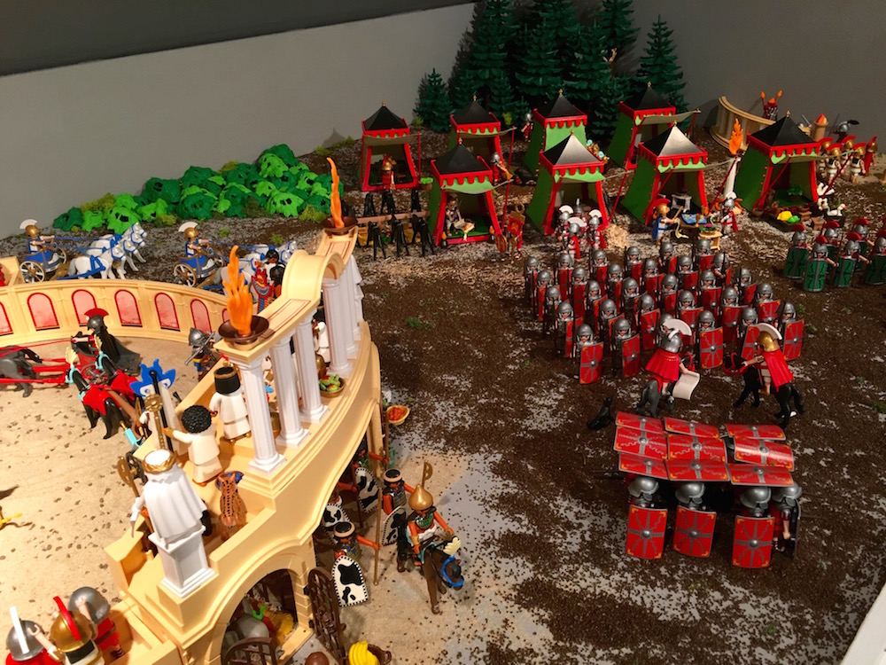 PLAYMOBIL-Diorama mit Arena, Gladiatorenkampf, Römerlager, Belagerungstürmen und Römer-Galeeren