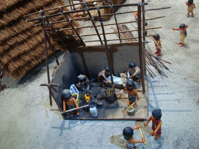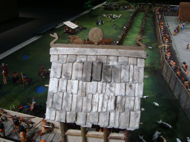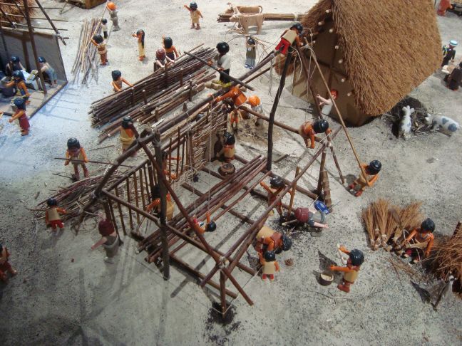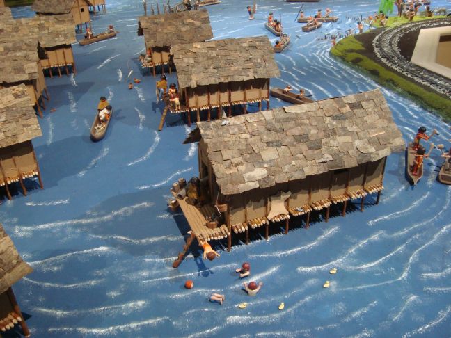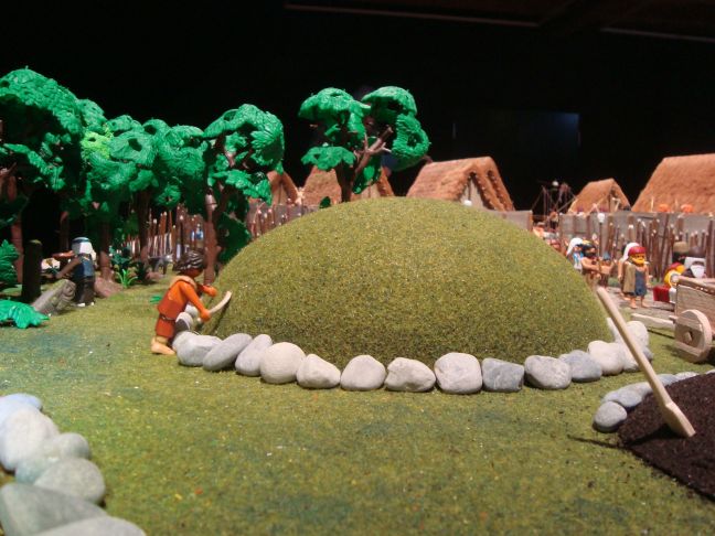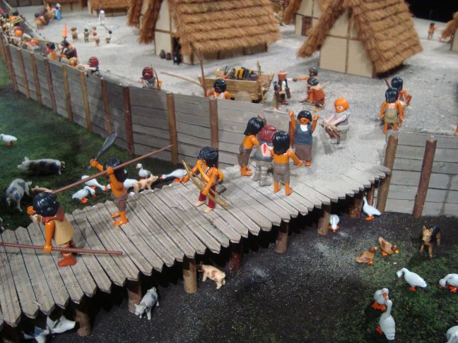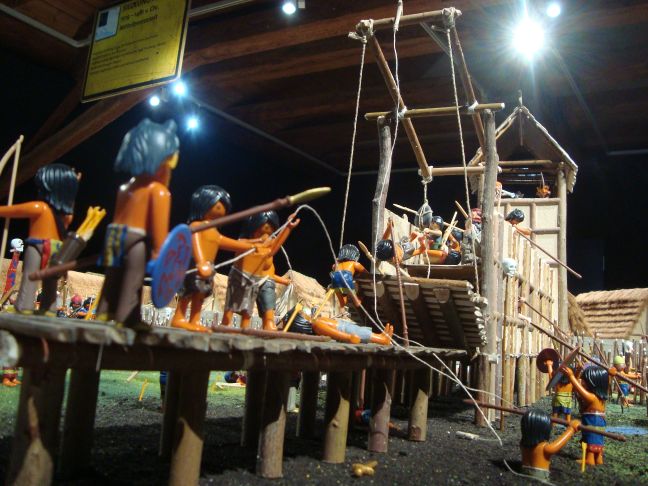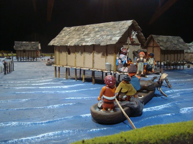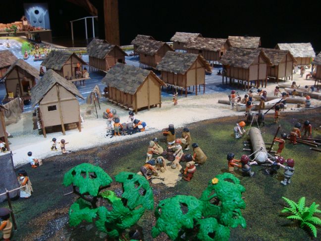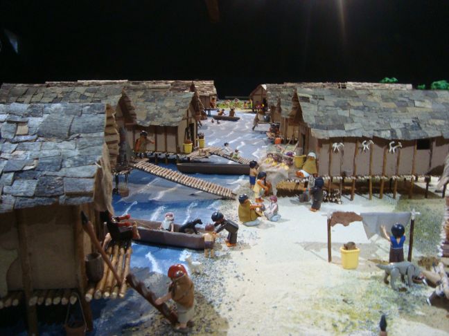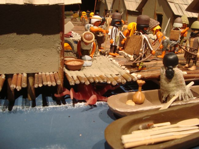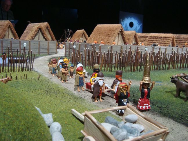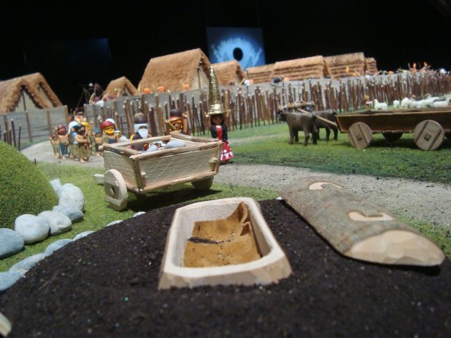 Gezeigt werden drei verschiedene Dörfer: Beim ersten wurden die Hütten in den Uferbereich oder den See gebaut, ohne einer bestimmten Ordnung zu folgen. Es lebten ca. 300 Menschen dort. Das zweite Dorf ähnelte einer Reihenhaussiedlung mit einer Hauptstraße in der Mitte; hier lebten ca. 60 Menschen. Das dritte Dorf war von einer Palisade umgeben und verfügte über einen Wehrturm. Hier zeigten die Ausstellungsmacher auch kultische Rituale, wie die Verehrung einer Mondgottheit, einen Begräbniszug, angeführt von einer Priesterin mit Goldhelm, einen Querschnitt durch ein Hünengrab etc. Überall waren witzige Details zu entdecken.